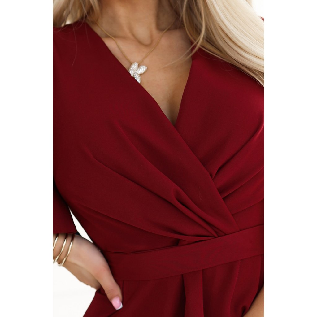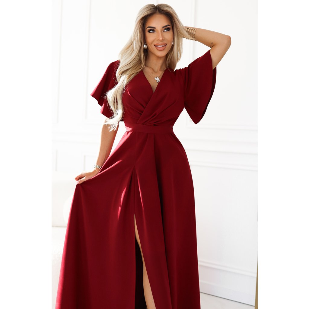 JENNIFER dlhé šaty s rozparkom na nohaviciach, rukávom a výstrihom - vínová farba 581-2