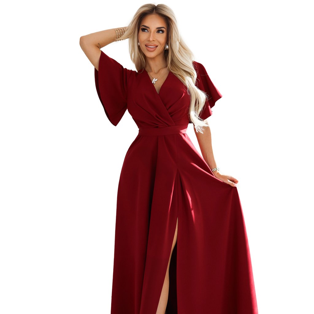 Jennifer Dress – elegantné dlhé šaty z bordového materiálu. Obálkový výstrih, krátke rukávy a nápadný rozparok na nohaviciach dodávajú celku triedu a ženský pôvab. Vypasovaný strih s opaskom krásne zvýrazní pás. Ideálne pre zvláštne príležitosti, elegantné večierky a večerné výlety.