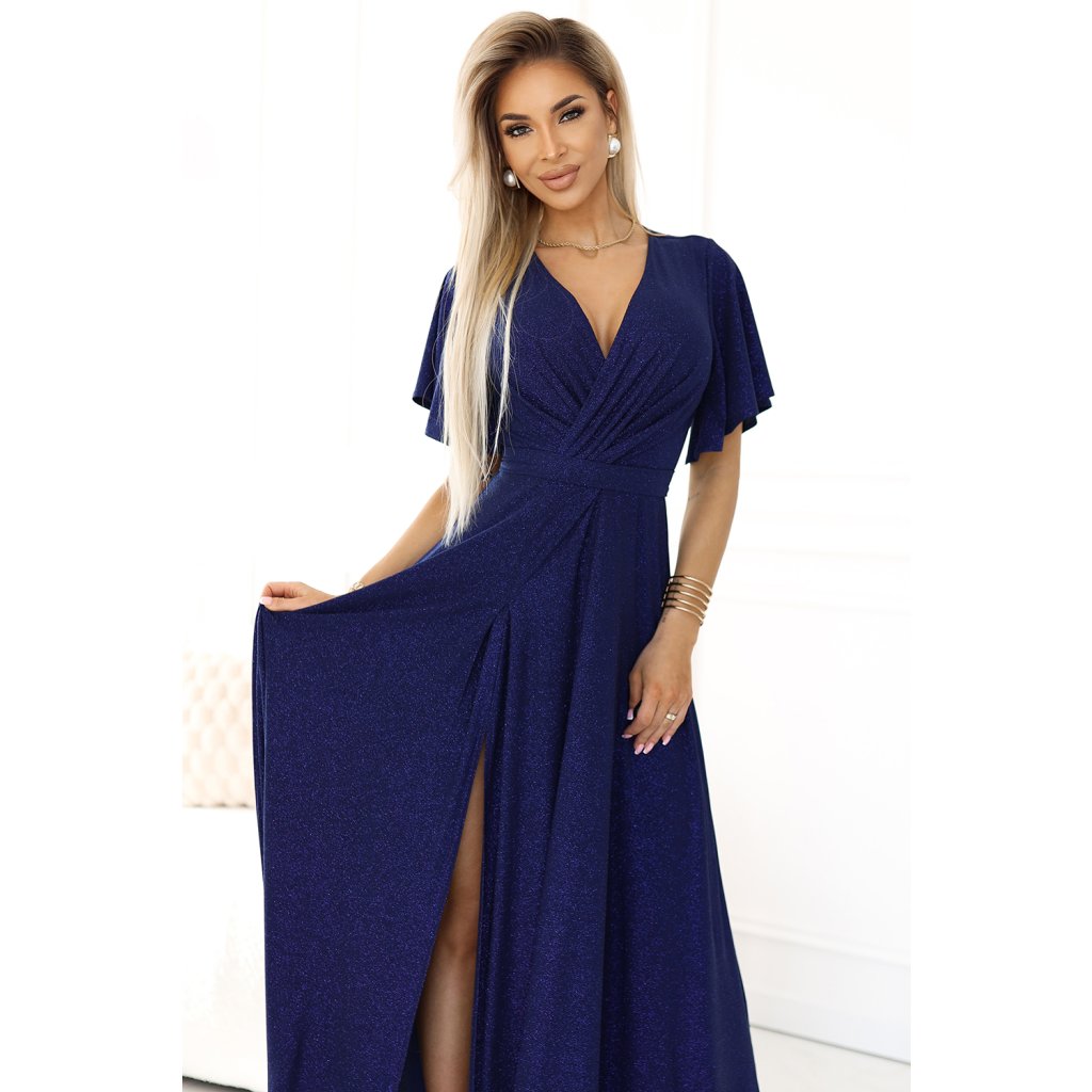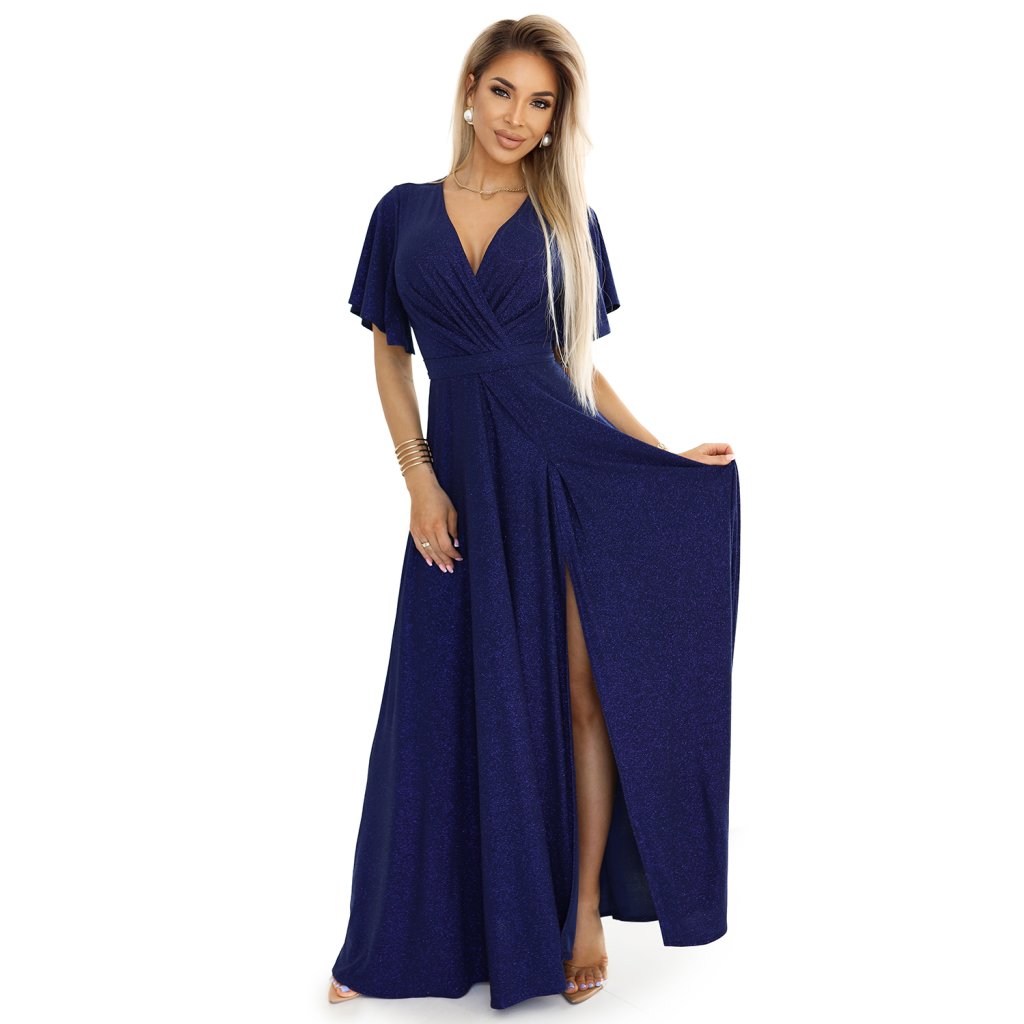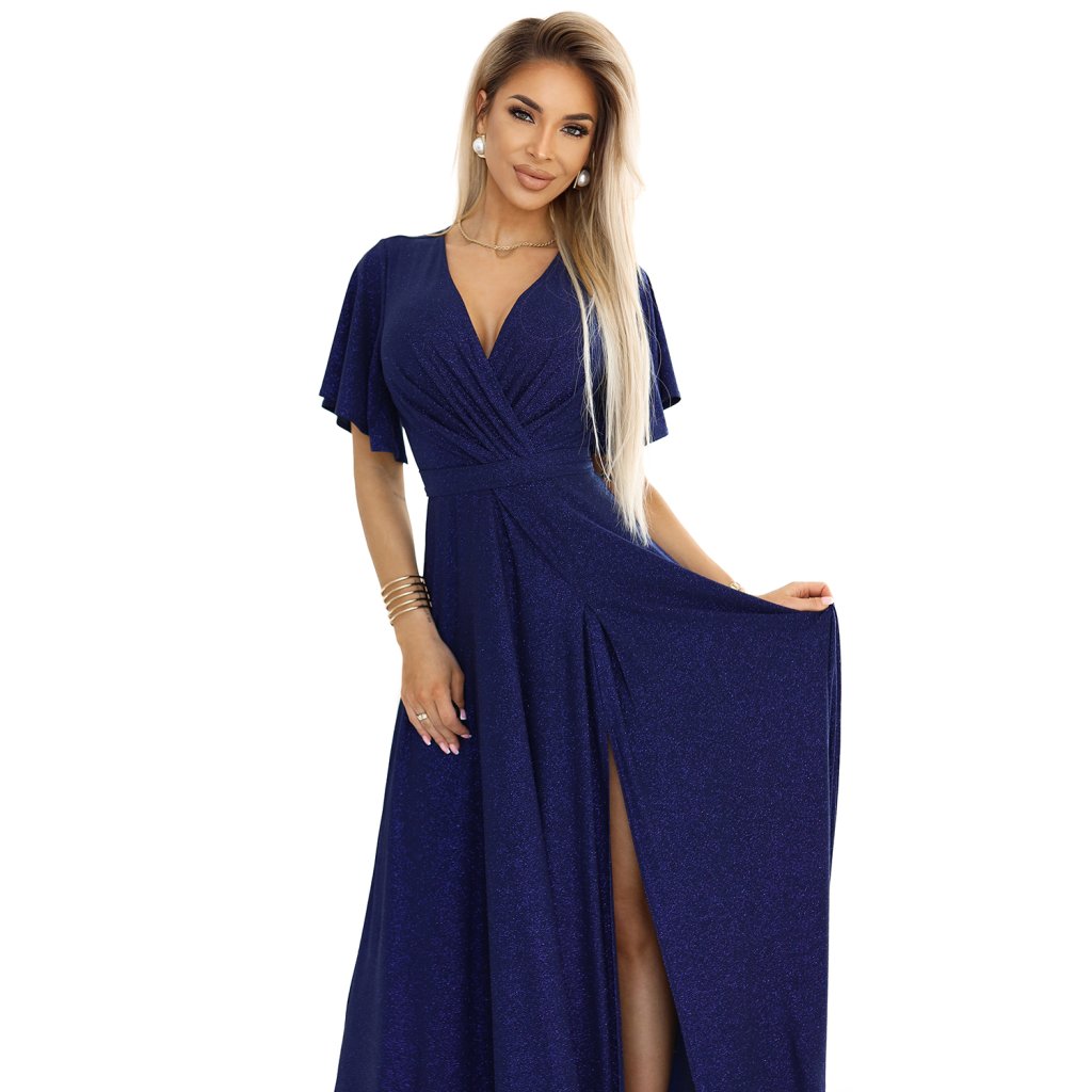 Jennifer Numoco Dress – štýlové dlhé brokátové šaty v hlbokom odtieni tmavomodrej. Obálkový výstrih, krátke rukávy a zmyselný rozparok na nohavici dodávajú eleganciu a ženskosť. Poľská výroba, vynikajúca kvalita – ideálne pre zvláštne príležitosti.