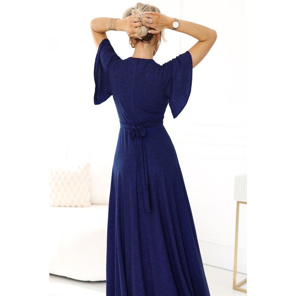 JENNIFER lesklé dlhé šaty s rukávmi a výstrihom - tmavomodrá s trblietkami 581-5