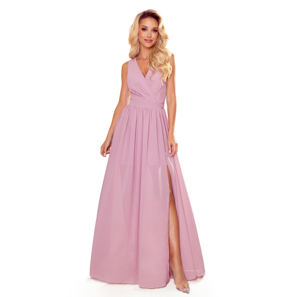 Justine - dlhé šaty s výstrihom, rozparkom na nohavici a zaväzovaním na chrbte. Vyrobené zo vzdušného materiálu v púdrovej ružovej farbe. Zapínanie vzadu na krytý zips. Poľský výrobok. Značka Numoco.