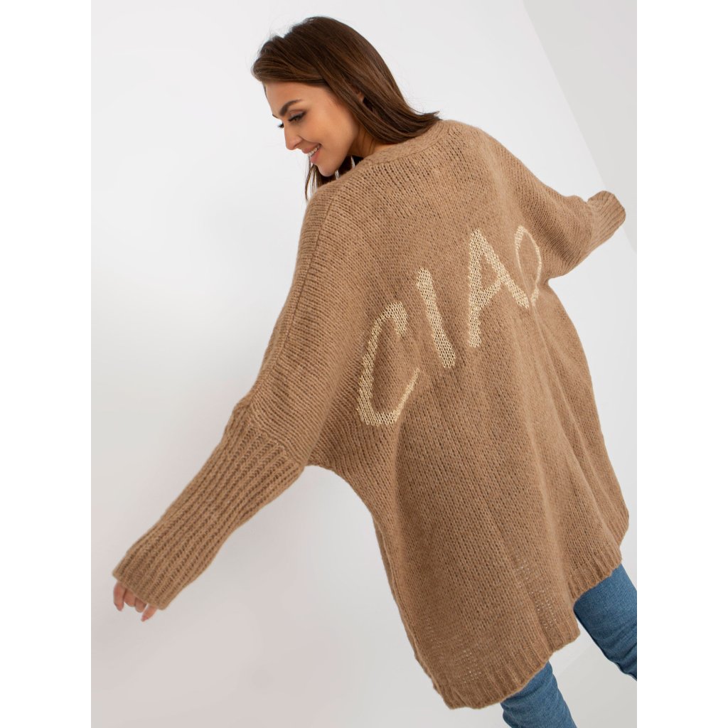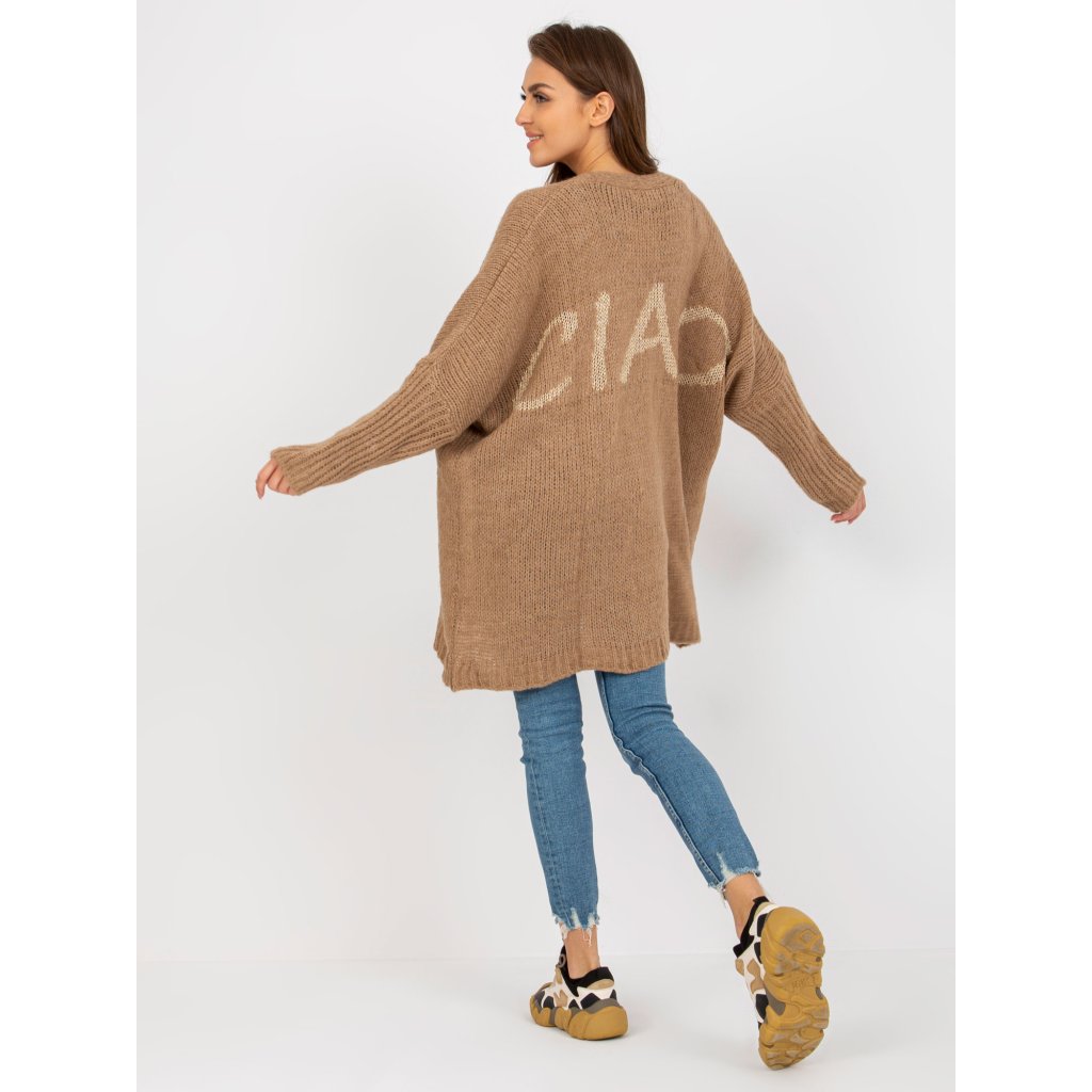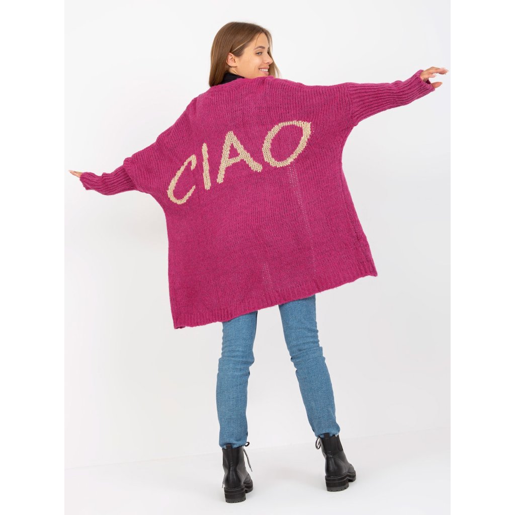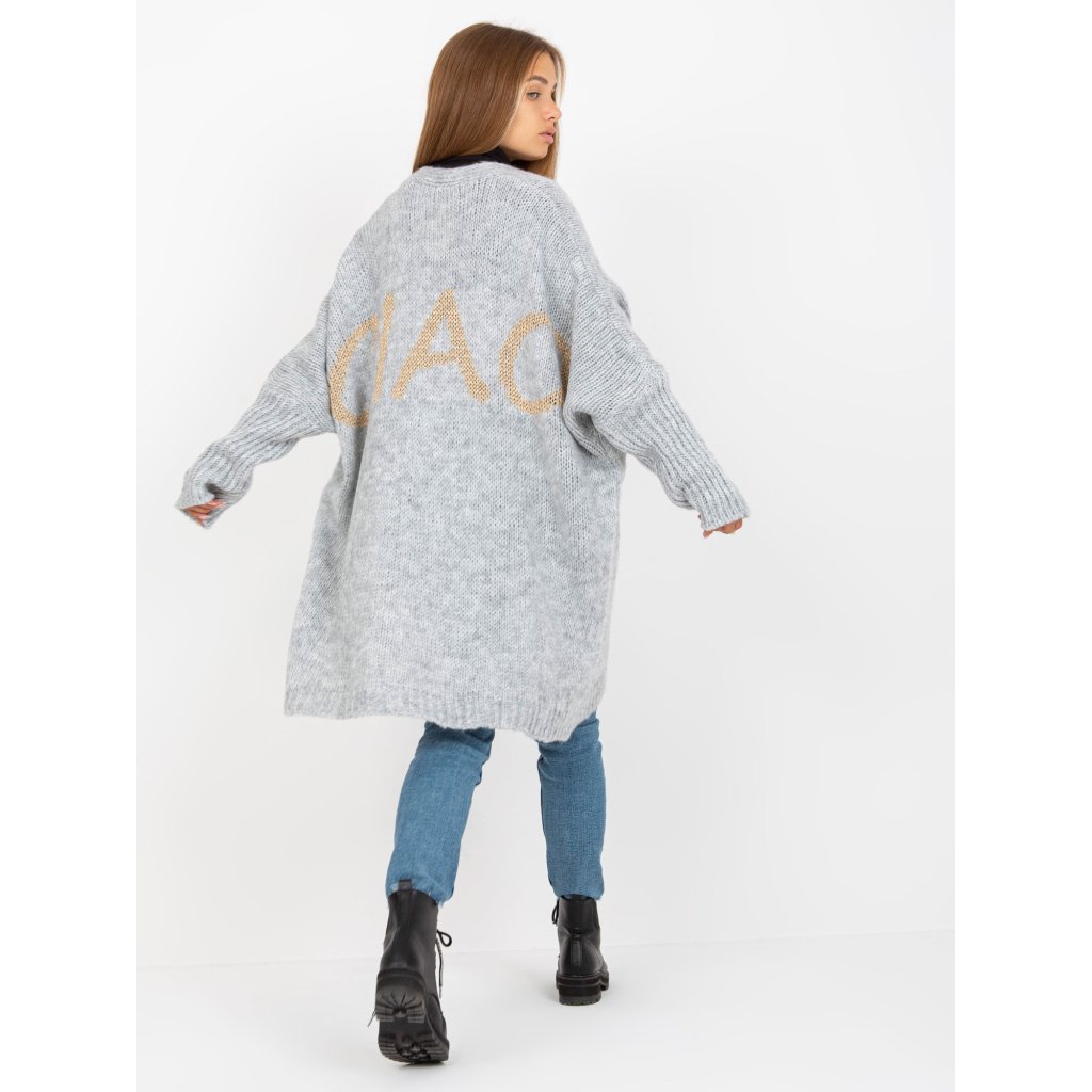 Dámsky kardigán s nápisom na chrbte.