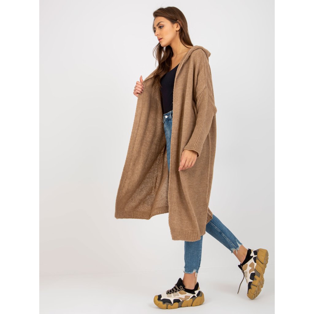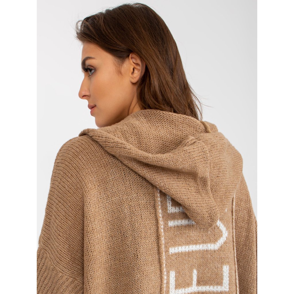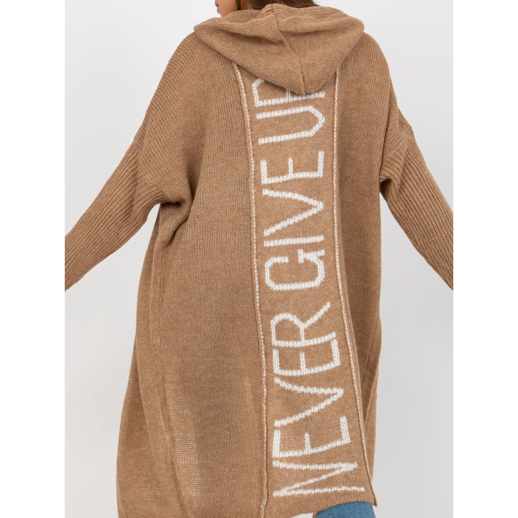 Tmavobežový pletený kardigán s nápisom "OH BELLA" na chrbte.