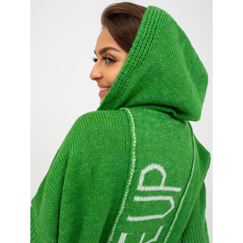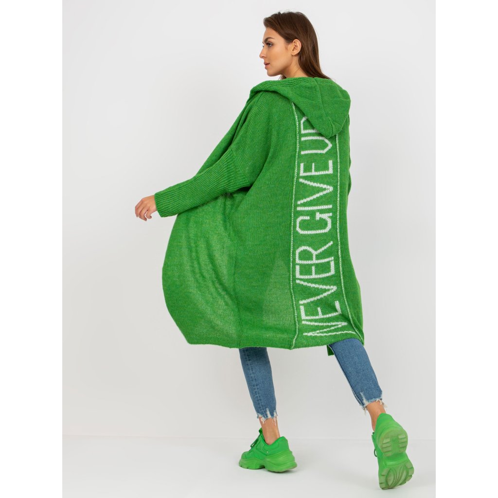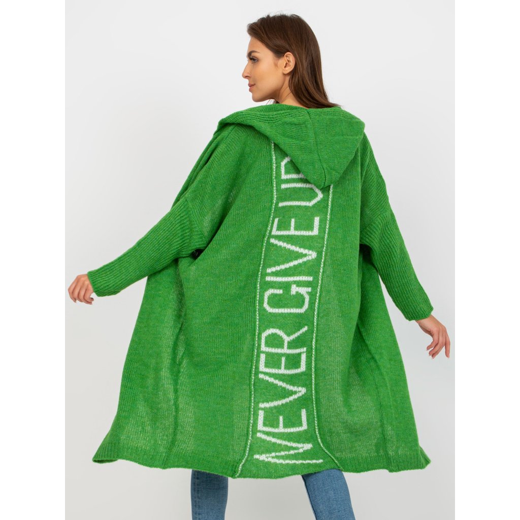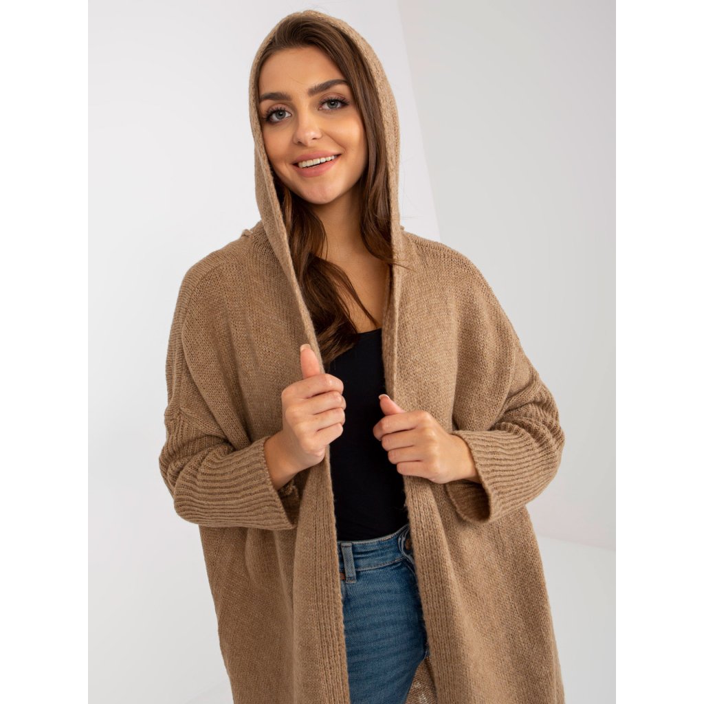 Tmavobežový pletený kardigán s nápisom "OH BELLA" na chrbte.