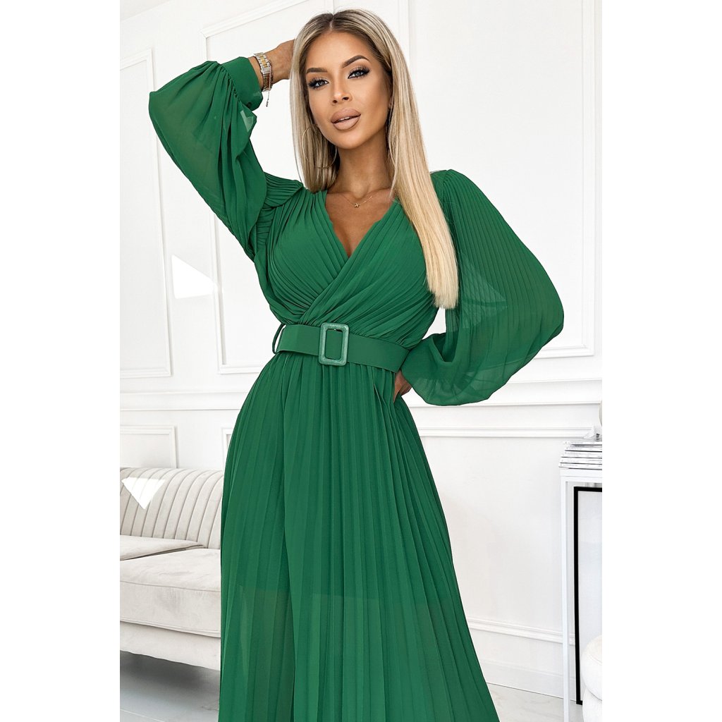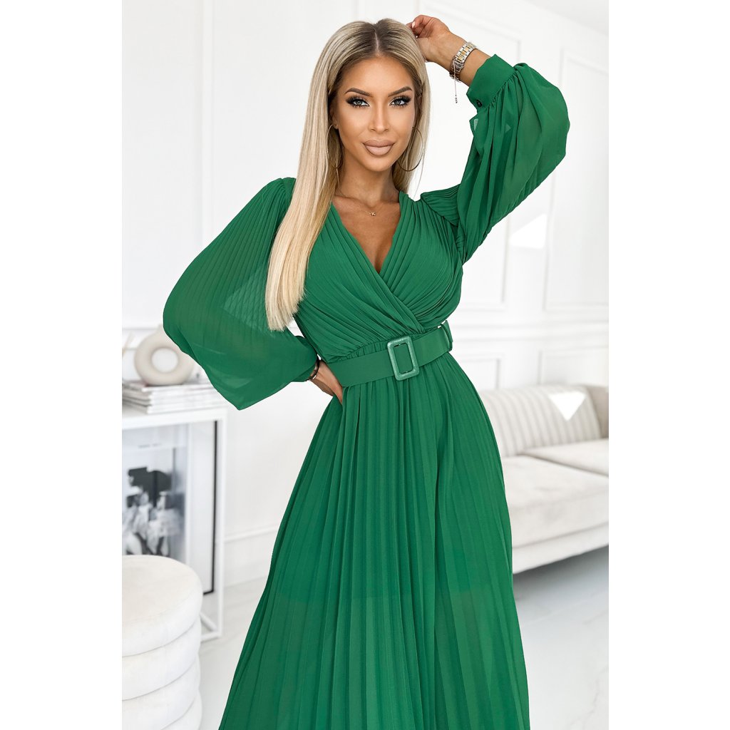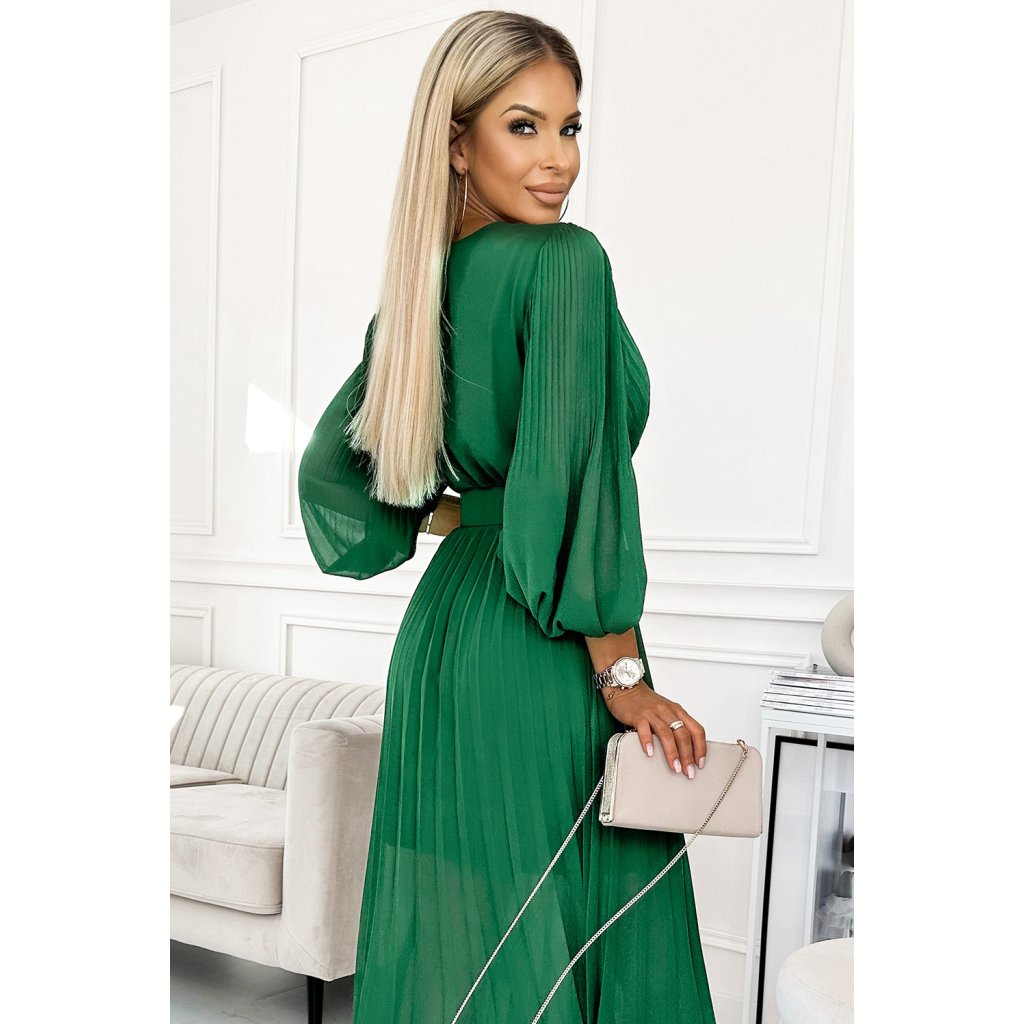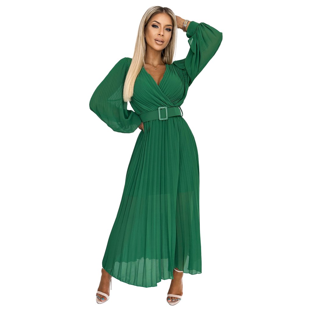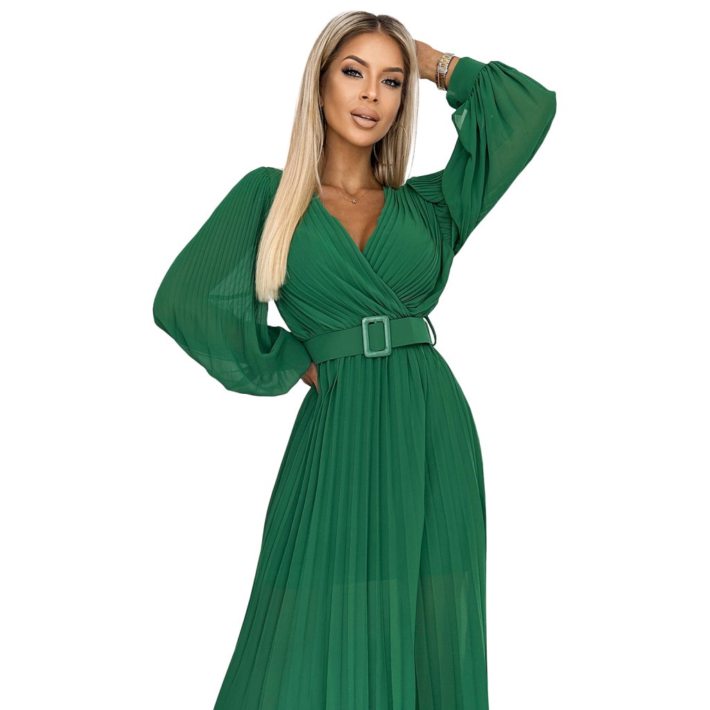 Numoco KLARA riasené šaty s opaskom a výstrihom - zelená 414-3