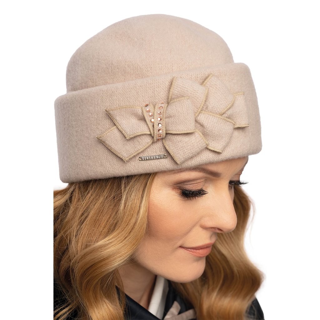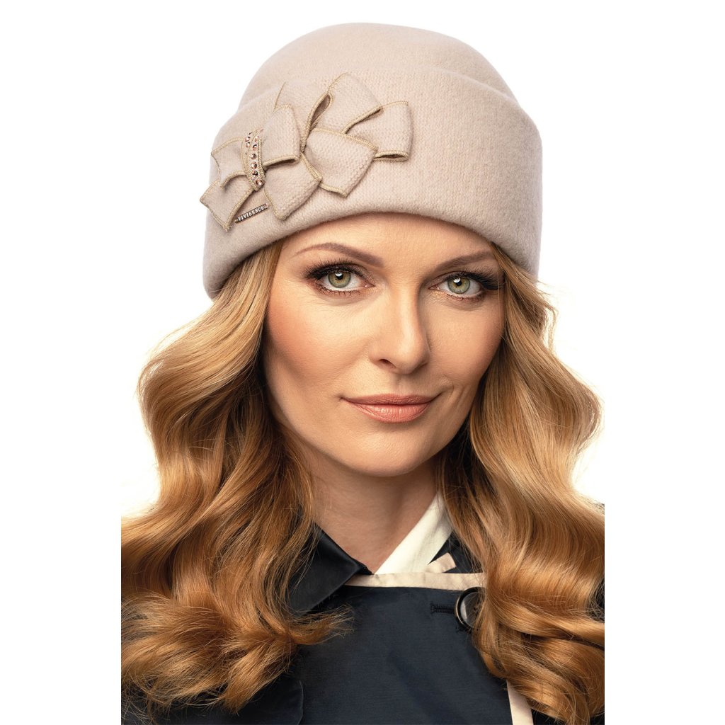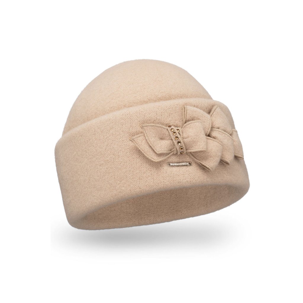 Ručne vyrobený elegantný dámsky toque.Je vyrobená z vysoko kvalitnej novej vlny Woolmark®. Priadza je certifikovaná podľa normy Oeko-Tex. Klobúk je zdobený aplikáciou v tvare mašle s kamienkami. Silnou stránkou toque sú ručne vyrábané a vyšívané ozdoby, ktoré robia každý kus jedinečným.