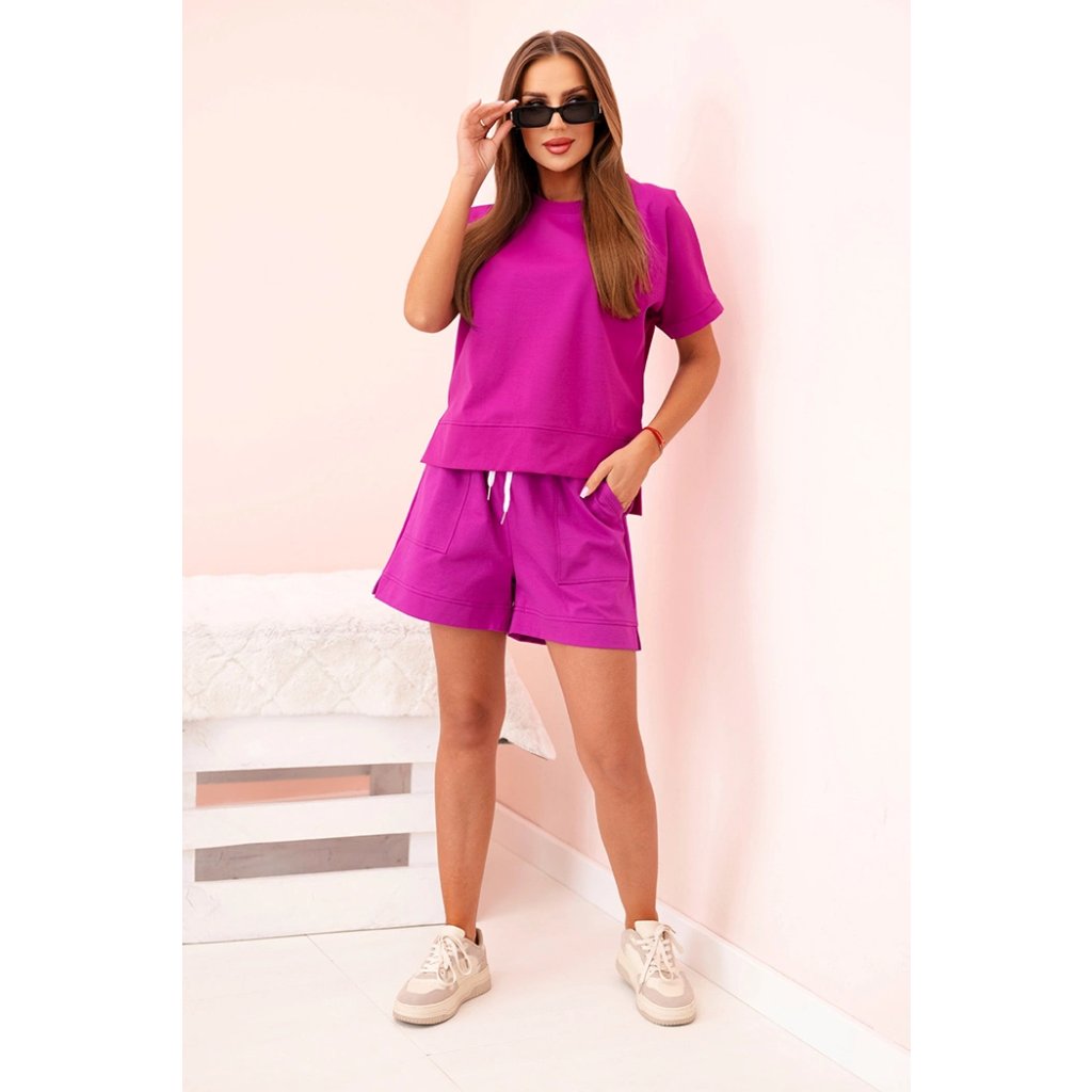 Hľadáte štýlovú a zároveň pohodlnú súpravu na teplejšie dni? Tento dámsky komplet s krátkym rukávom a šortkami je ideálnou voľbou pre ženy, ktoré si cenia pohodlie a módny vzhľad. Voľný strih blúzky s predĺženým zadným dielom a elastické šortky s vysokým pásom a vreckami zaisťujú, že sa tento komplet skvele hodí ako na doma, tak aj na prechádzky alebo víkendové výlety. Materiál s prímesou elastanu zaručuje príjemné prispôsobenie postave a plnú voľnosť pohybu. Celok je ladený v ležérnom štýle, ktorý ľahko skombinujete s obľúbenými teniskami alebo sandálmi.