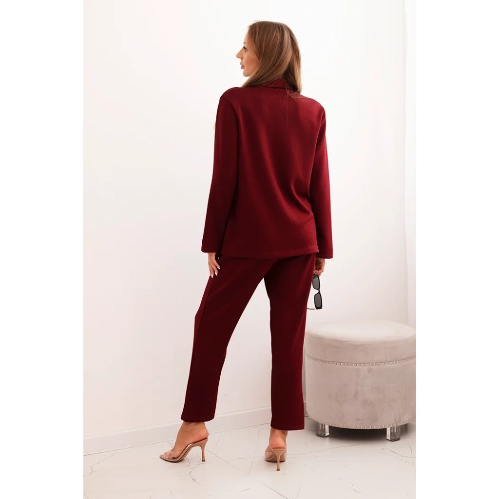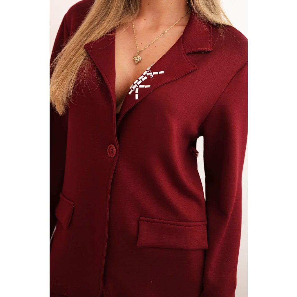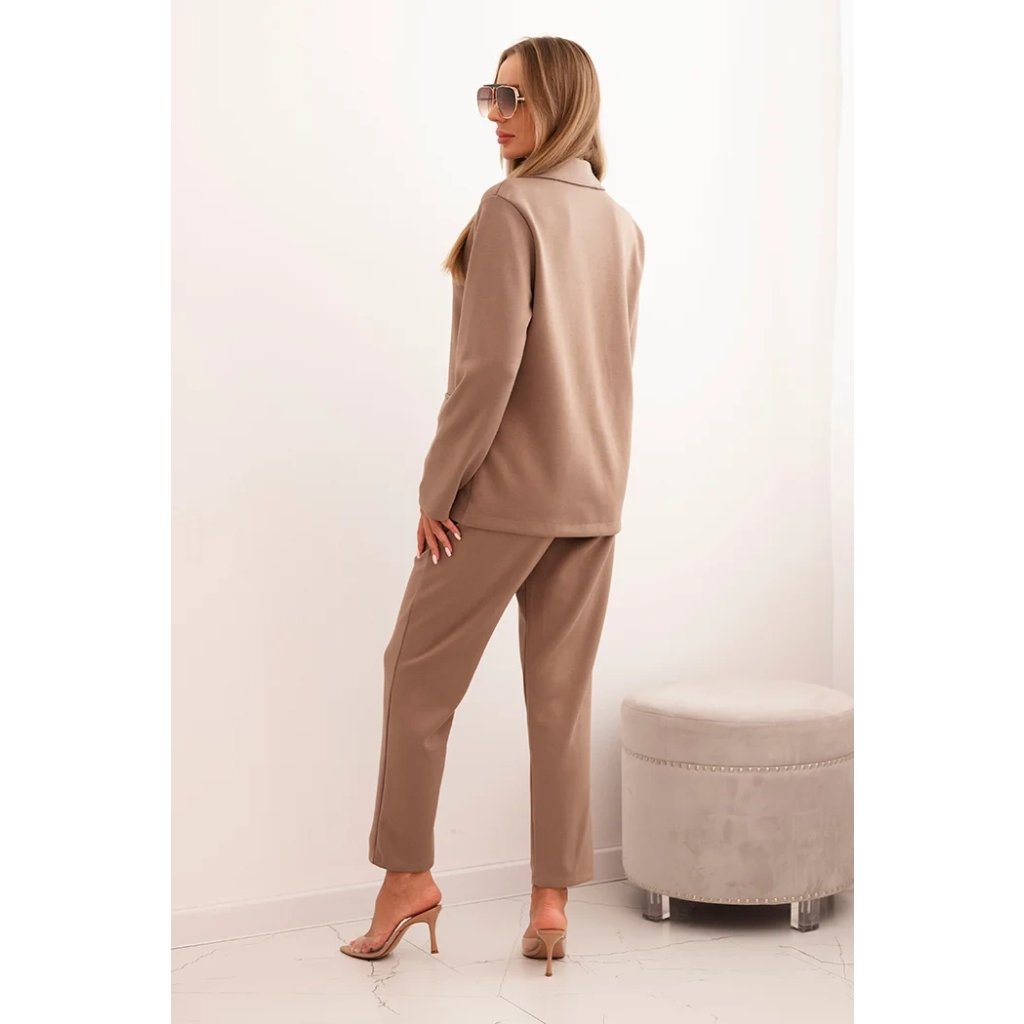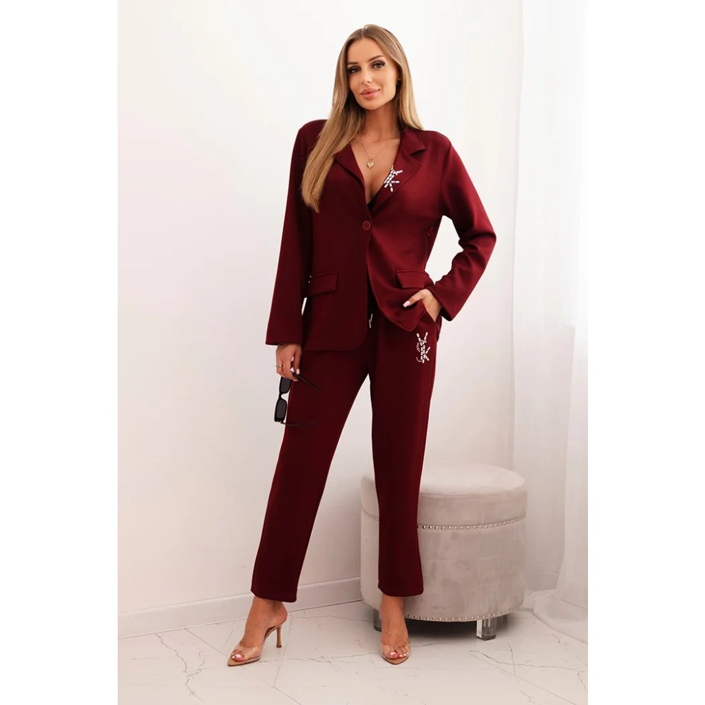 Elegantný dámsky komplet s viskózou je ideálnou kombináciou klasiky a modernosti. Sako s jednoduchým strihom a ozdobným motívom z kamienkov na prsiach dodáva štylizácii jedinečný charakter, a pohodlné nohavice s elastickým pásom a jemnou dekoráciou tvoria súdržný a štýlový celok. To je vynikajúca súprava na mnoho príležitostí – do práce, na schôdzky či na každodenné vychádzky.