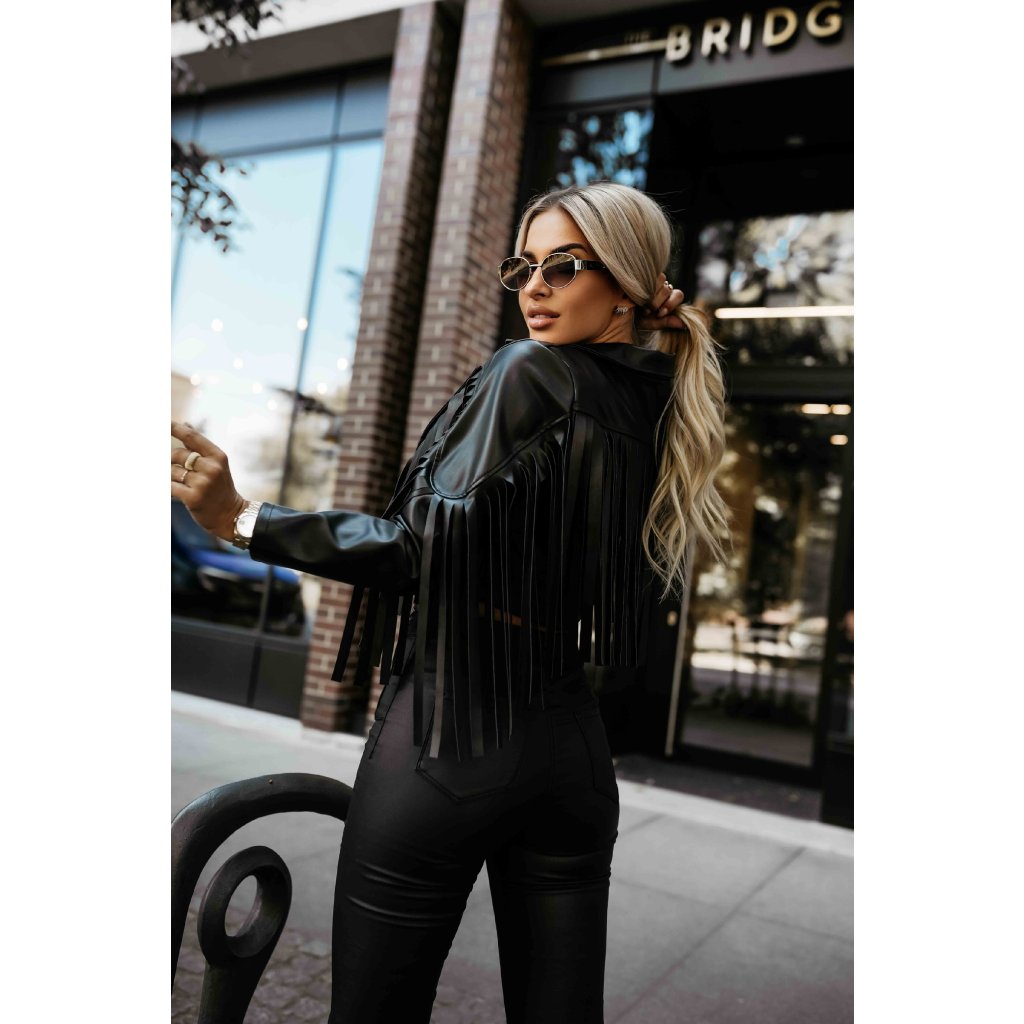 Krátka motorkárska bunda s strapcami z mäkkej eko kože - čierna 624-3