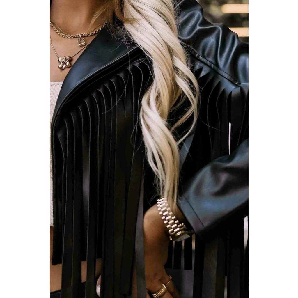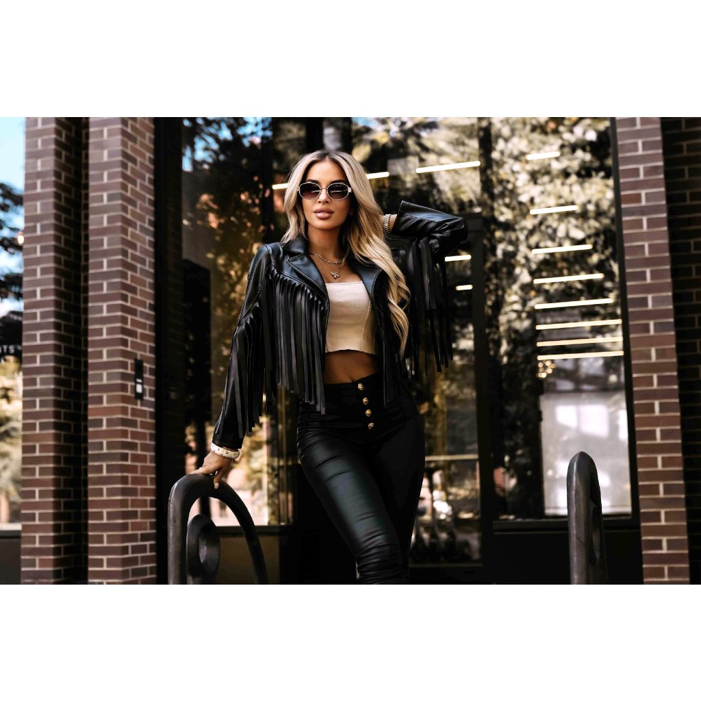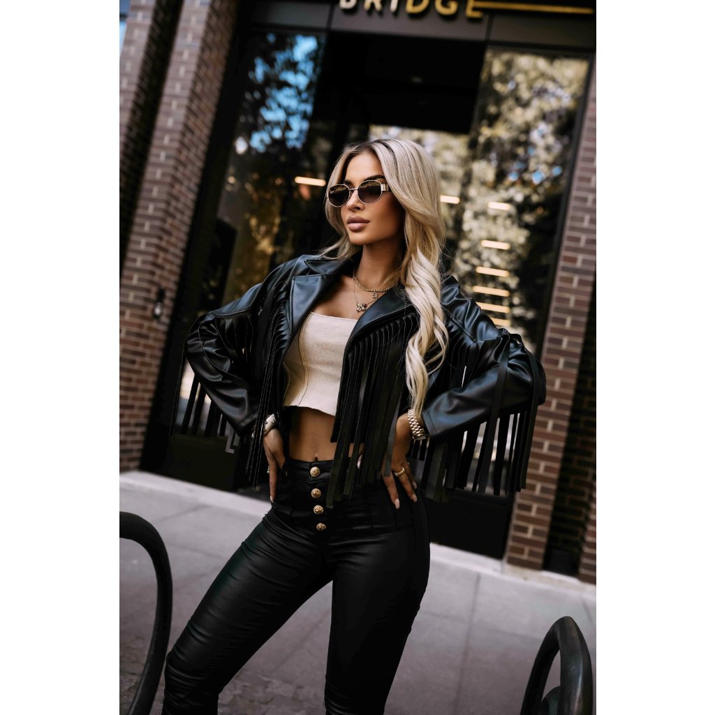 Táto štýlová čierna motorkárska bunda so strapcami od Numoco Basic je výrazná a ženská, ideálna na vytvorenie odvážnych outfitov. Vyrobené v Európe.