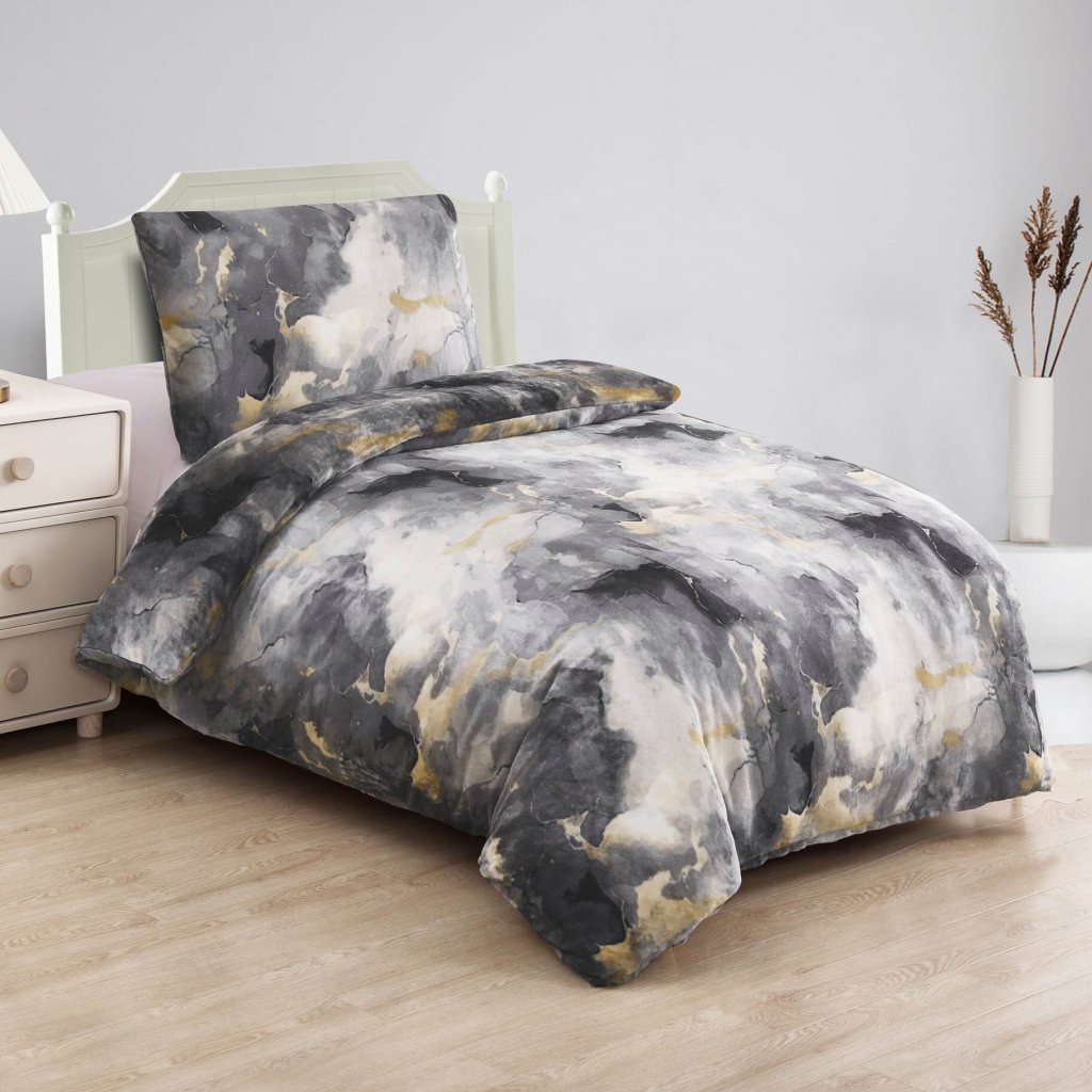 Štýlové obliečky Mikroflanel Mramor sivý s elegantným mramorovým vzorom v odtieňoch sivej, bielej a jemného zlata dodajú spálni moderný a luxusný vzhľad. Mikroflanel je hebký, hrejivý a veľmi príjemný na dotyk – ideálny pre chladné obdobie.