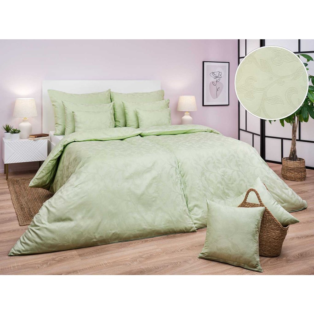 Elegantné damaškové obliečky Rokoko zelené prinášajú do spálne sviežu a upokojujúcu atmosféru. Jemný rastlinný vzor vytkaný v modernej svetlozelenej farbe pôsobí luxusne a nadčasovo. Vďaka použitiu 100% česanej egyptskej bavlny si užijete príjemný, mäkkučký a kvalitný spánok každú noc.