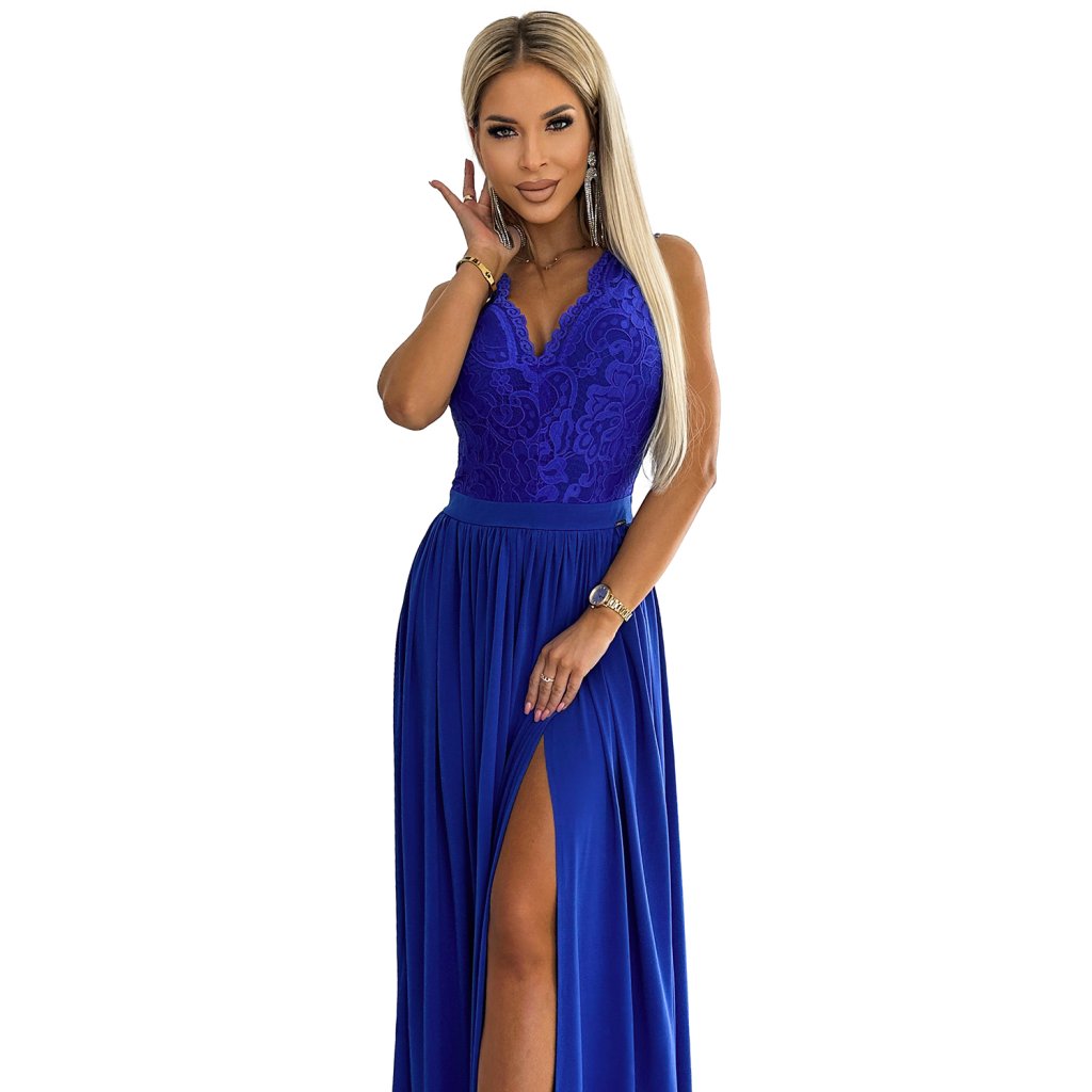 Numoco LEA dlhé šaty s čipkovaným výstrihom - modré 211-7
