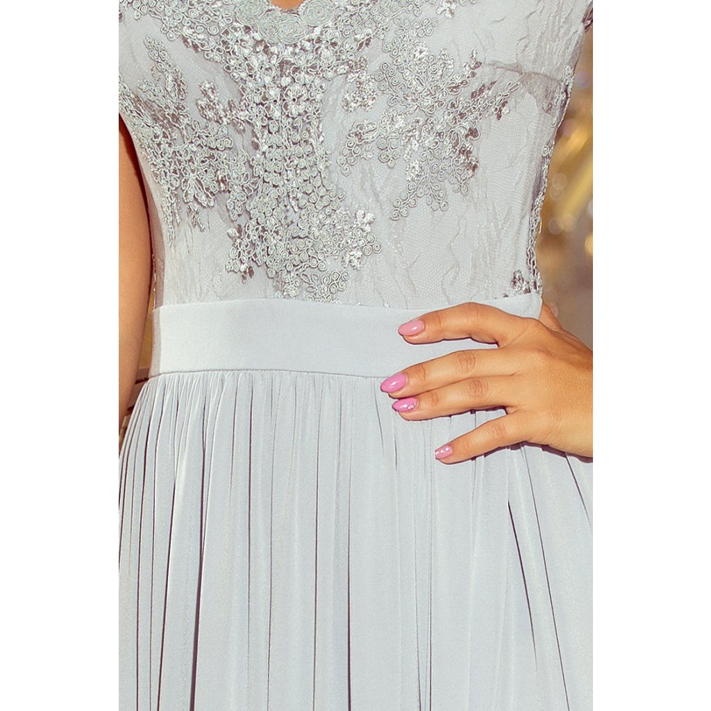LEA dlhé šaty s vyšívaným výstrihom - strieborná farba 215-1