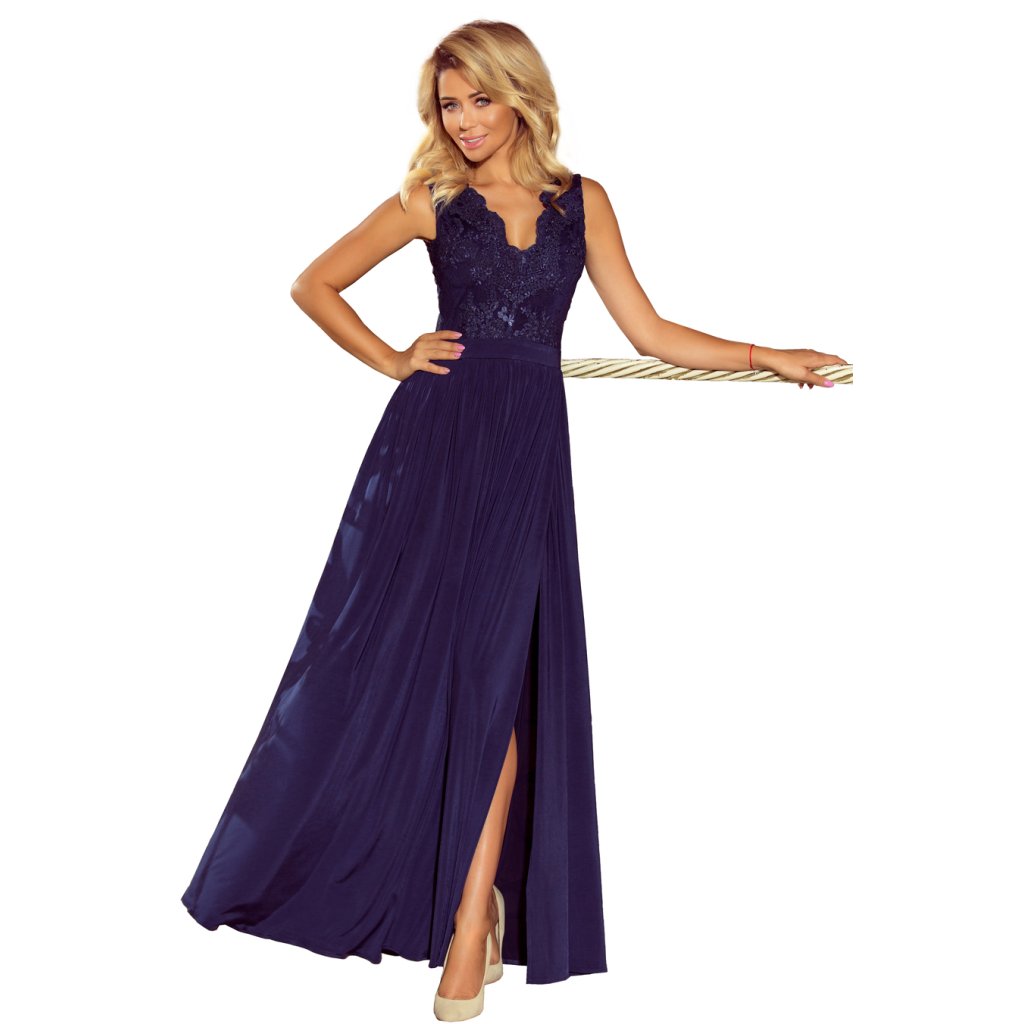 LEA dlhé šaty s vyšívaným výstrihom - tmavomodré 215-2 - výpredaj