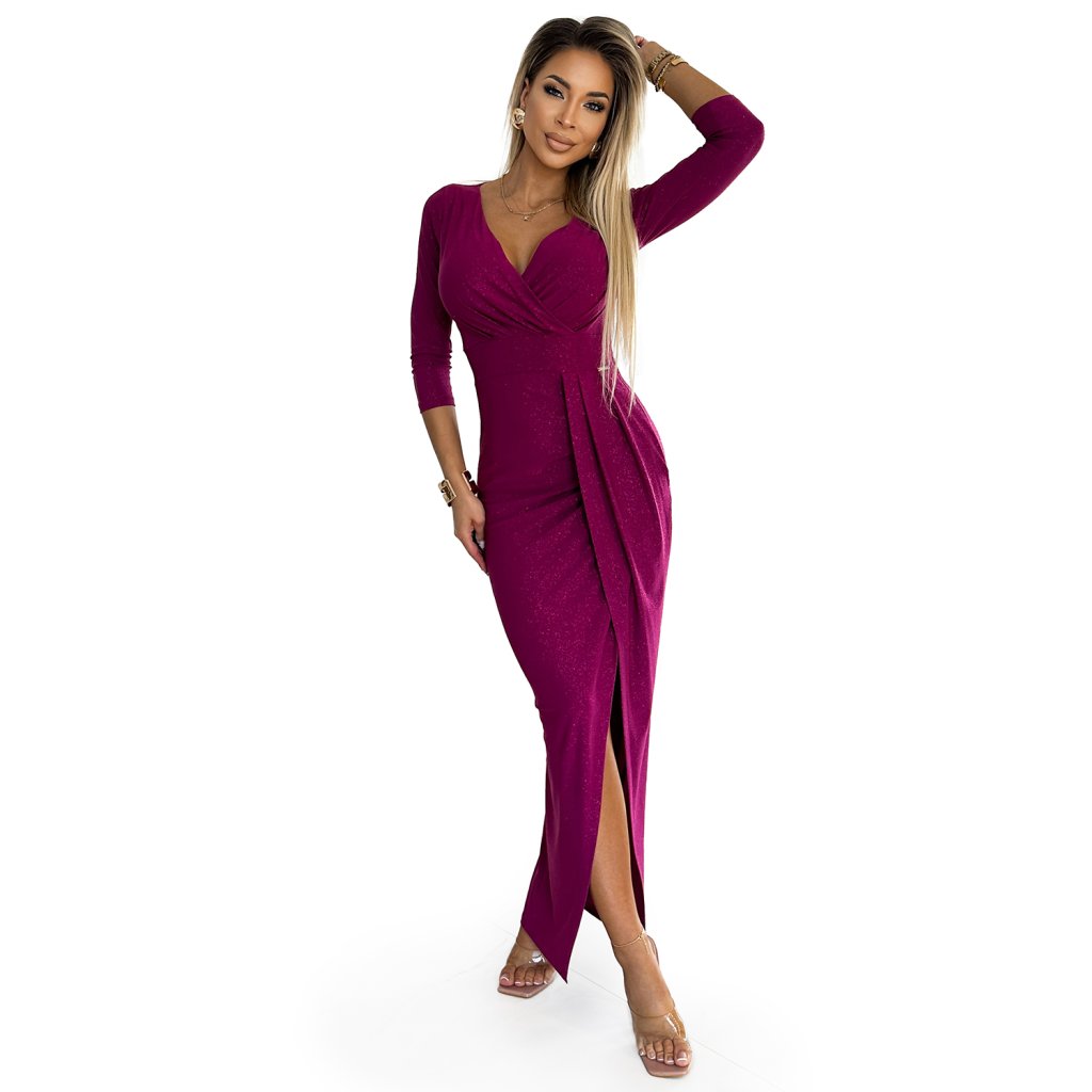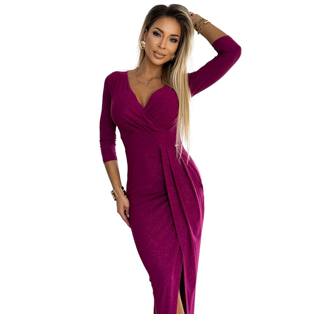 Lesklé maxi - dlhé šaty s listovým výstrihom a rozparkom na nohavici. Vyrobené z elastického materiálu s trblietkami. Farba: fuchsiová. Značka numoco. Poľská výroba.
