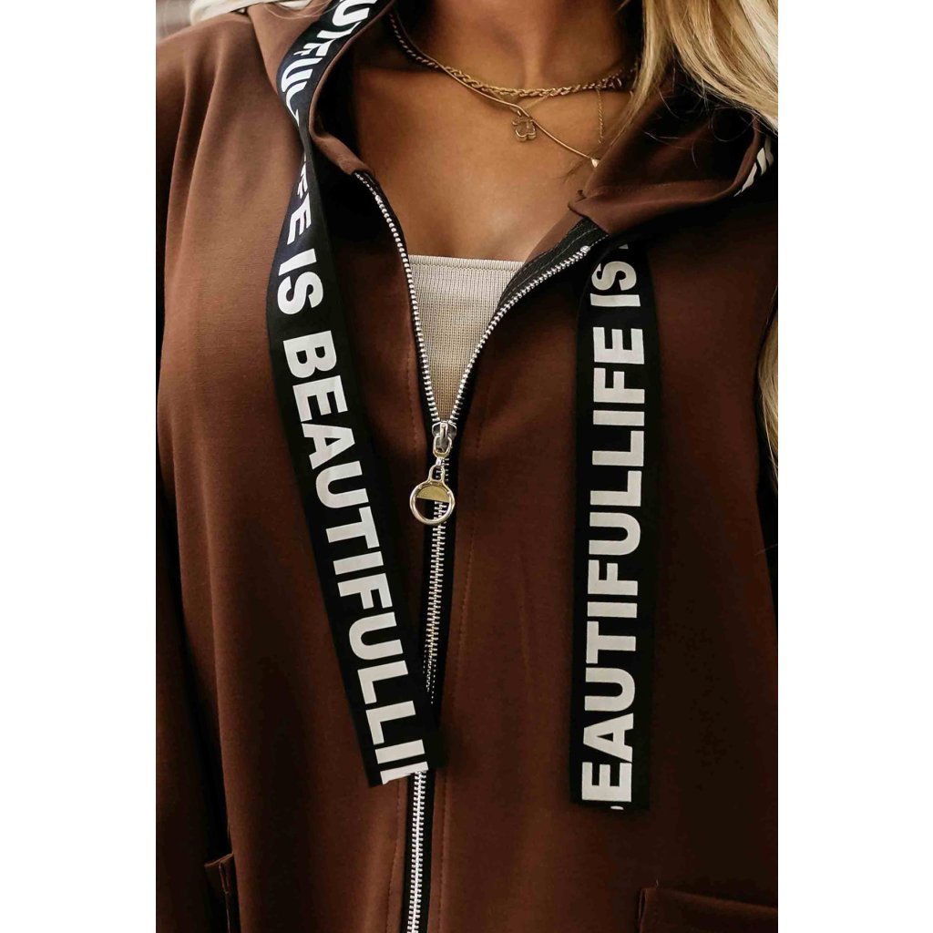 Objavte moderný štýl a pohodlie - dámsky kabát od značky Numoco Basic je ideálnou kombináciou ležérnosti a módnych detailov. Je ušitý v Európe s dôrazom na každý detail a zaujme efektnými nápismi BEAUTIFUL LIFE na stuhách pri kapucni a funkčným zipsom.