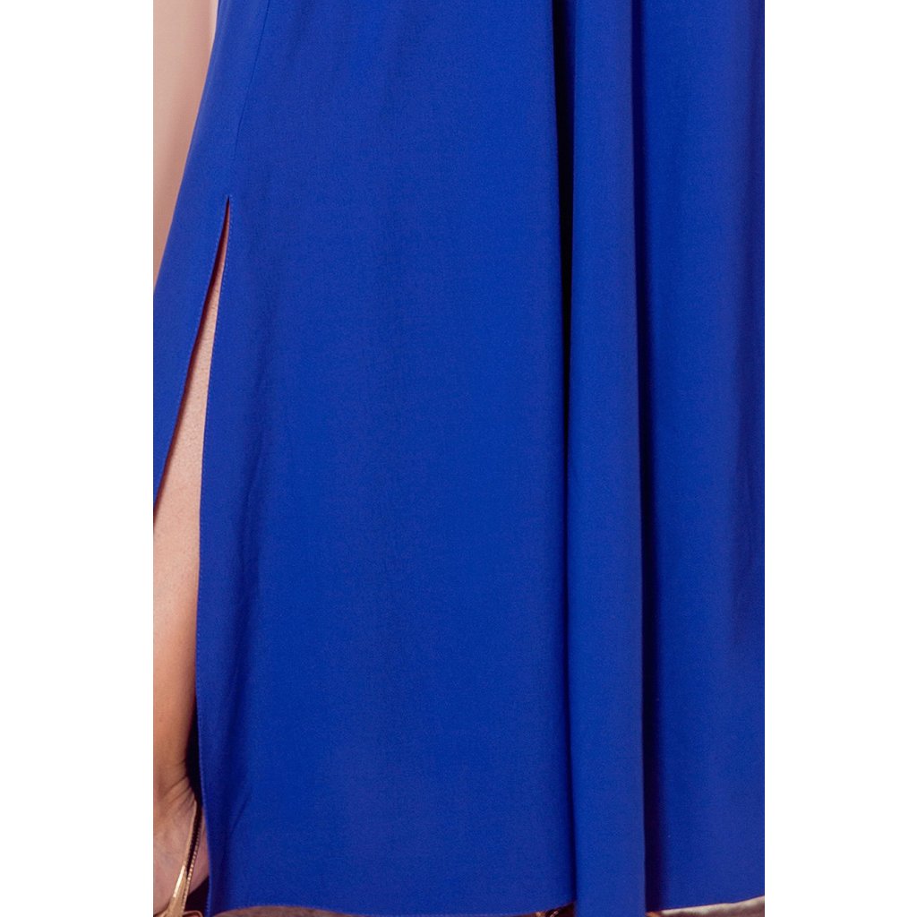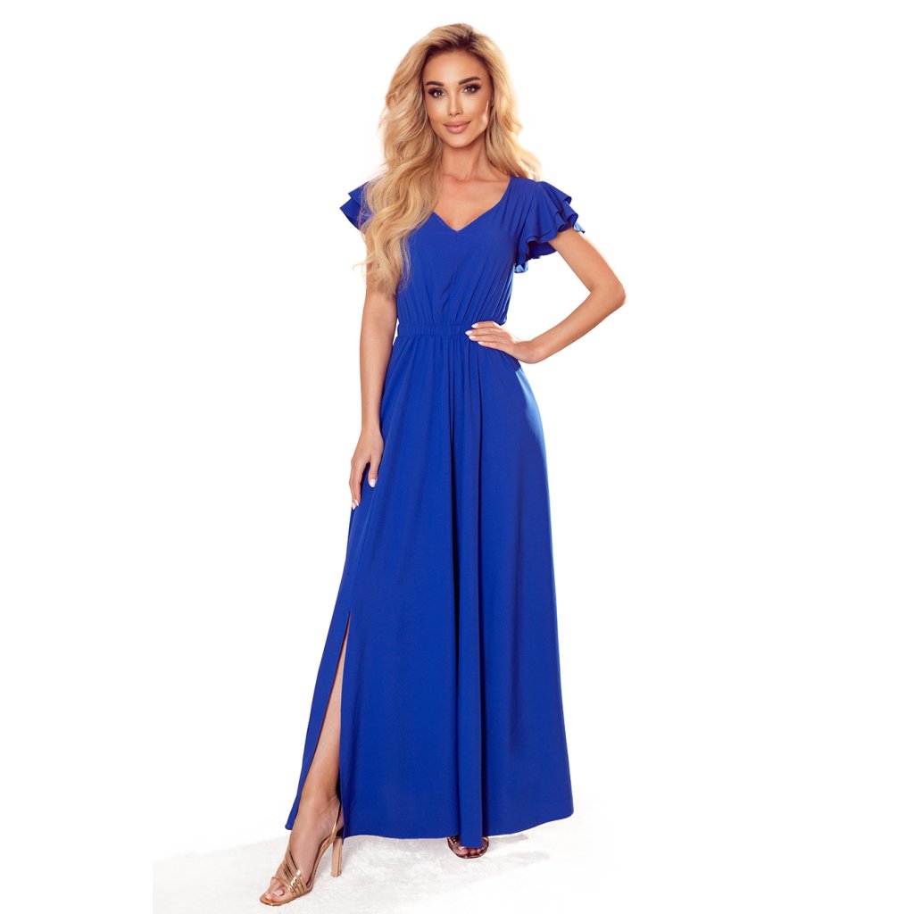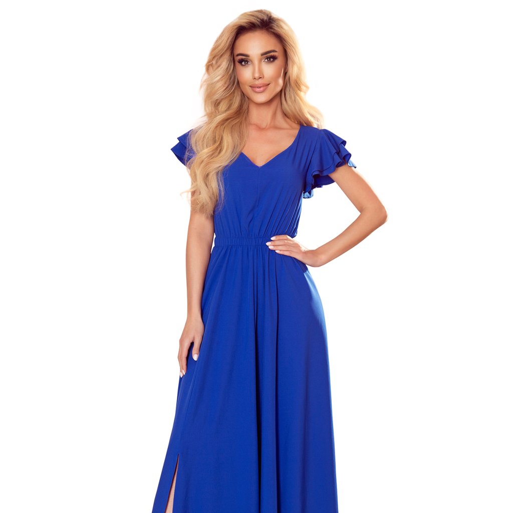 Lidia - dlhé šaty s výstrihom a volánikmi na ramenách. Farba: modrá. Numoco. Poľská produkcia.