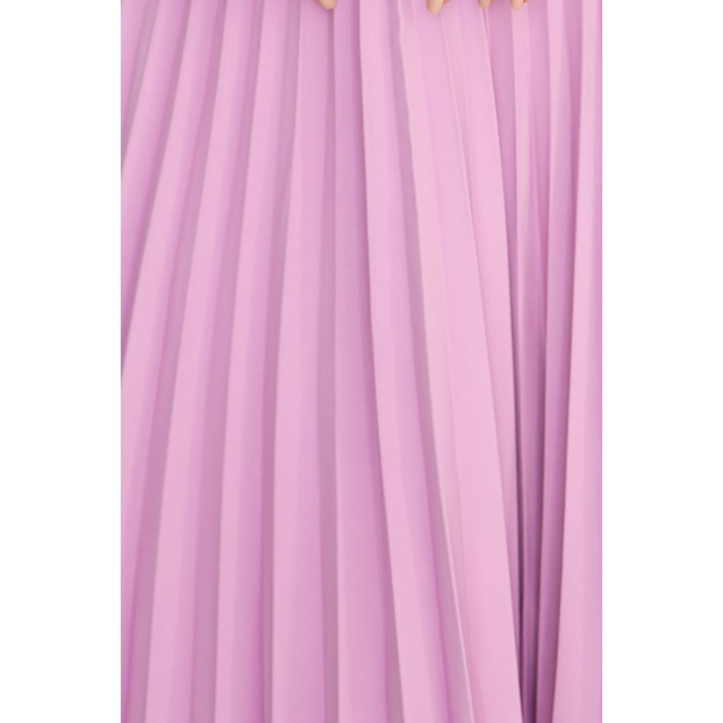 Lila – elegantné riasené midi šaty vo vresovej farbe sú perfektnou voľbou pre ženy, ktoré ocenia štýl a pohodlie. Vyrobené z ľahkého plisovaného materiálu, krásne sedí na postave a podčiarkuje jeho prednosti. Opasok so zaväzovaním na mašľu dodáva romantický nádych a zvýrazňuje pás. Krátke rukávy umožňujú voľnosť pohybu, zatiaľ čo skrytý zips na zadnej strane zaisťuje dokonalé uchytenie. Ideálne pre elegantné výlety, letné párty a rodinné oslavy. Poľský výrobok. Značka Numoco.