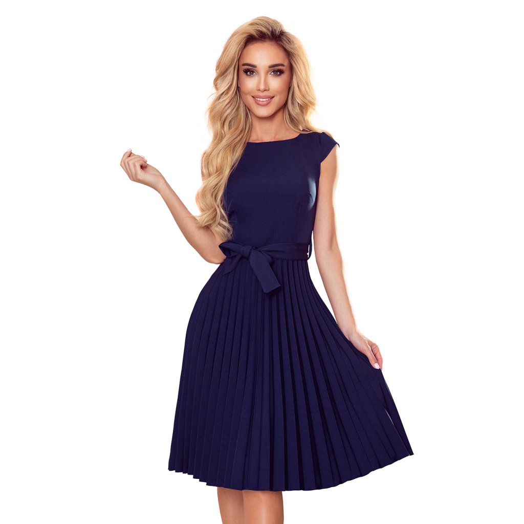 Lila - plisované šaty s krátkym rukávom a opasok. Upevnené vzadu s krytým zipsom. Tmavo modrá farba. Značka Numoco. Poľská produkcia.