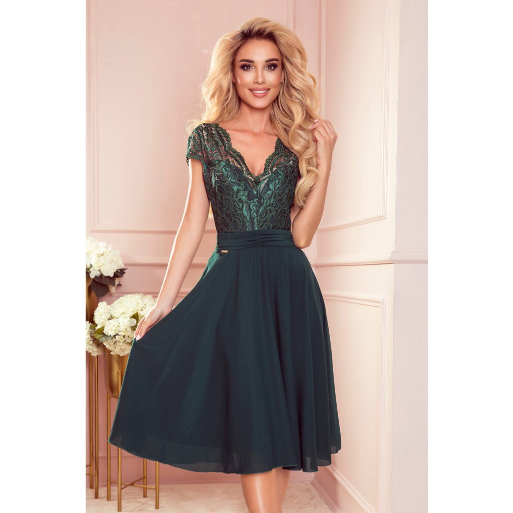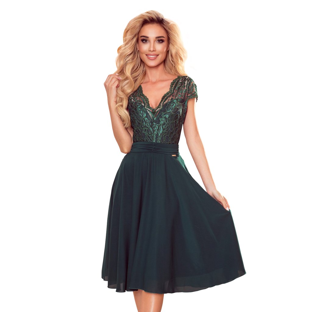 Linda - exkluzívne šifónové šaty s krátkym rukávom, čipkovaným výstrihom a priehľadom na chrbte - farba zelená. Poľská výroba. Značka Numoco.
