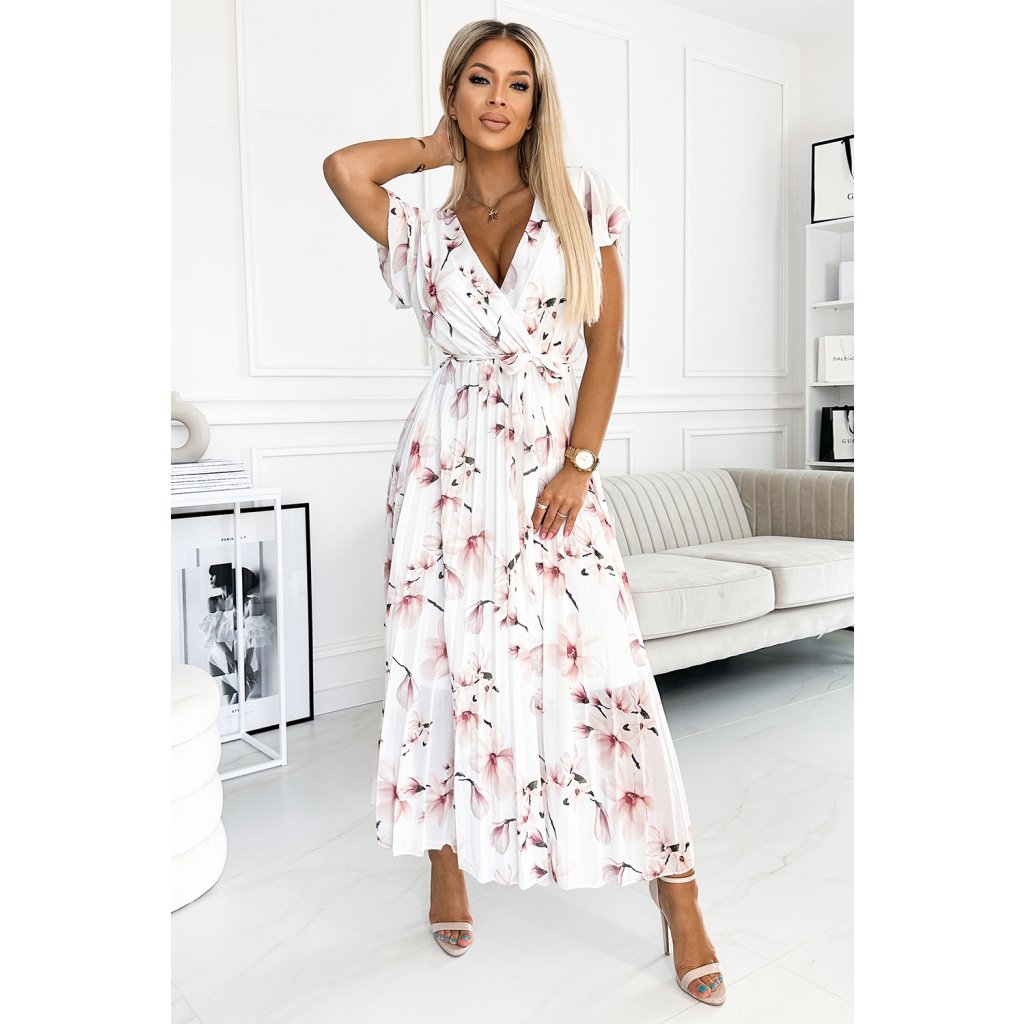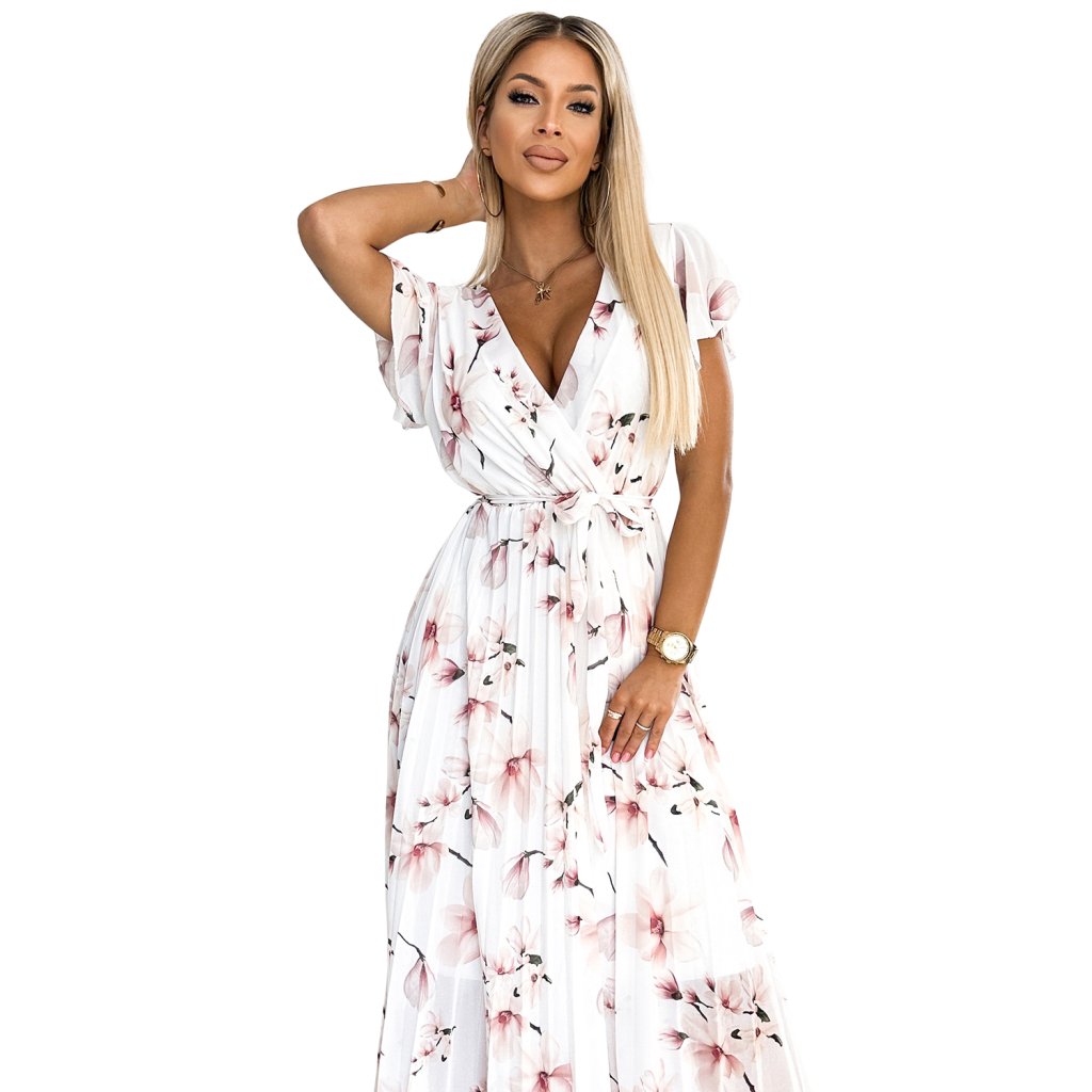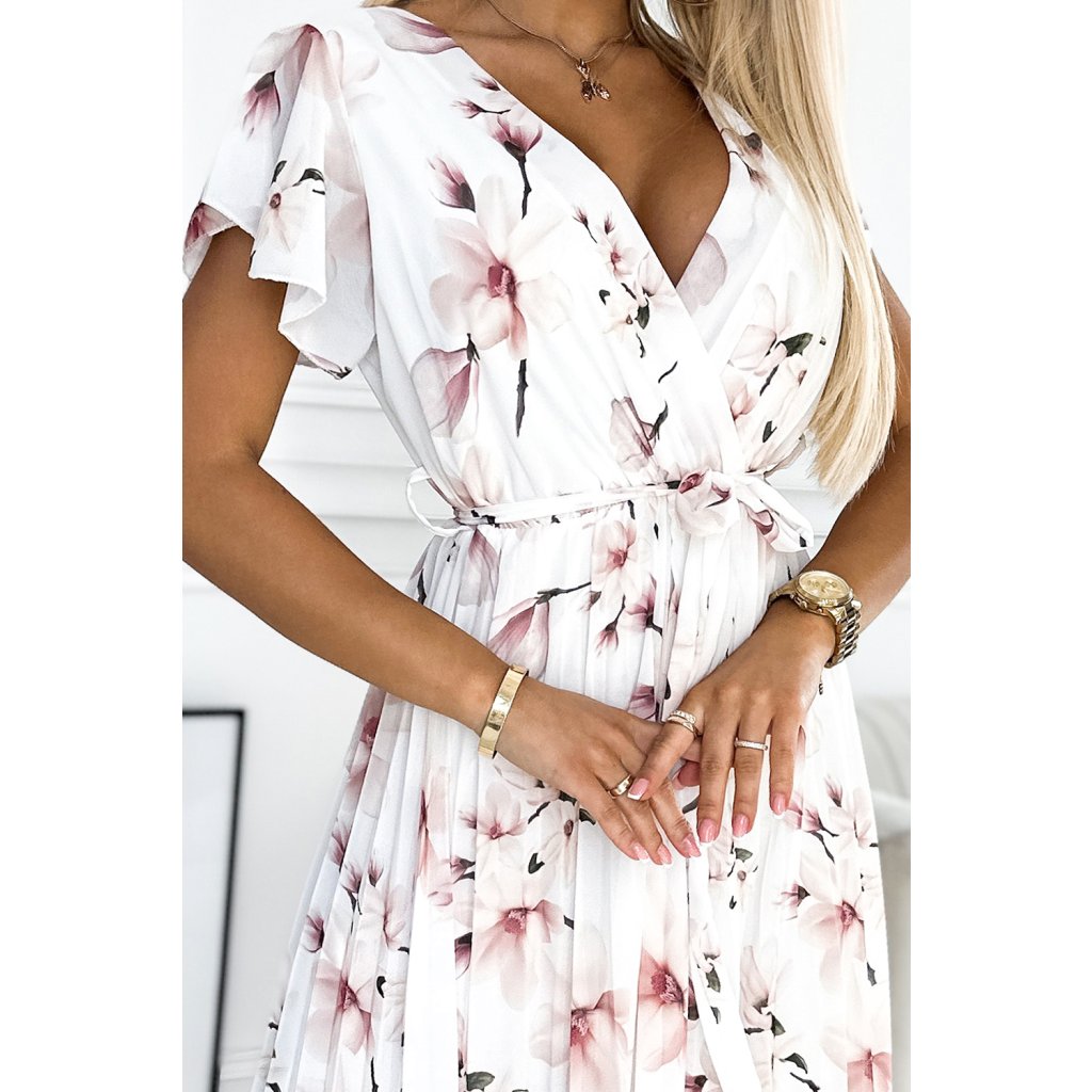 LISA Plisované midi šaty s výstrihom a volánmi - broskyňový kvet na bielom pozadí 434-4