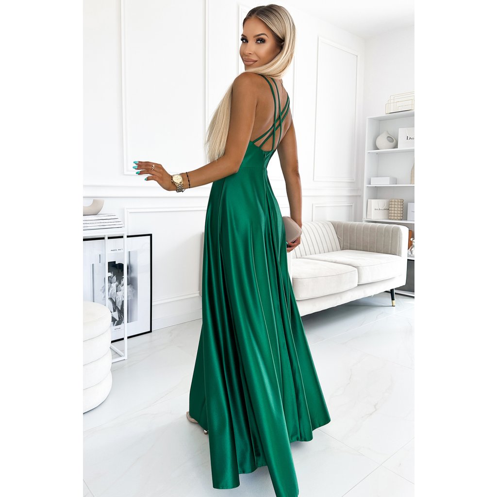 Luna - elegantné dlhé saténové maxi šaty s rozparkom na nohaviciach, veľkým výstrihom a prekríženými ramienkami na chrbte. Vyrobené z lesklého, hladkého, ľahko elastického zeleného saténu. Šaty ideálne na svadby, Silvestra, ples, karneval a ďalšie významné príležitosti. Poľská výroba. Značka Numoco.