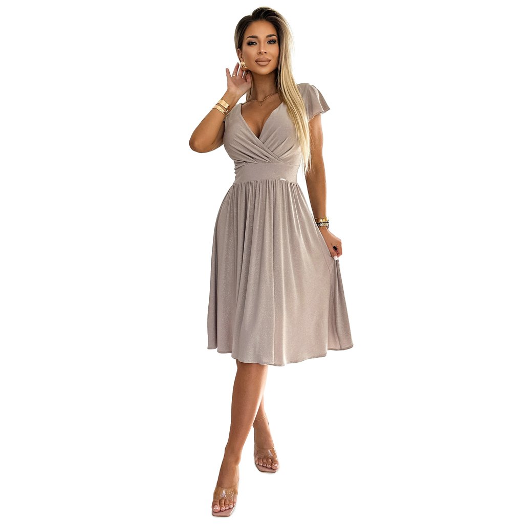 Matilde - rozevláté šaty s listovým výstrihom a krátkymi rukávmi. Vyrobené z pružného, lesklého béžového materiálu. Značka Numoco. Poľský výrobok.