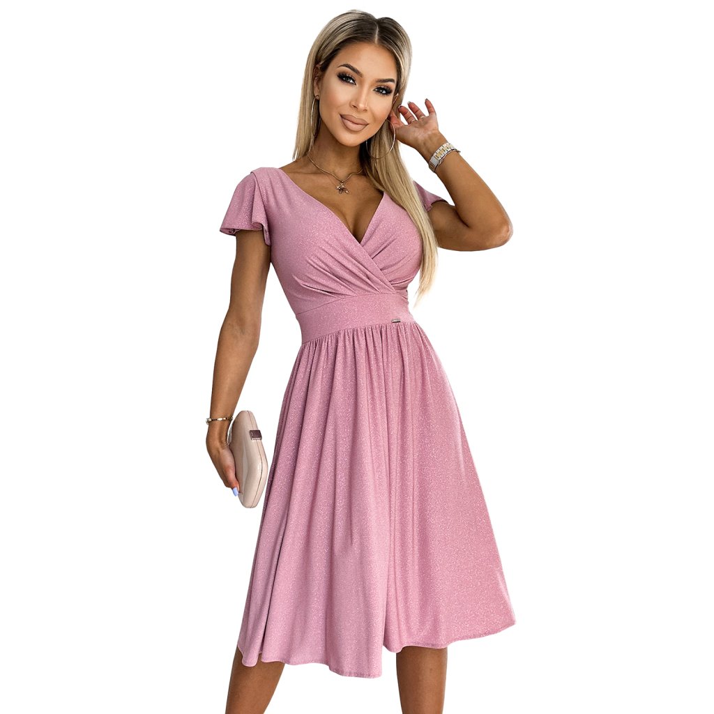 Numoco MATILDE Šaty s výstrihom a krátkym rukávom - púdrová ružová s trblietkami 425-2