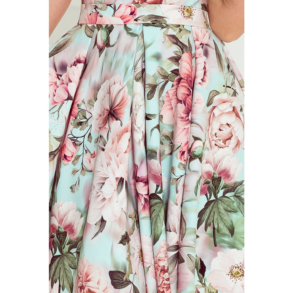 Numoco MAYA Šaty s dlhším chrbtom, výstrihom a opaskom - ružové kvety 478-1