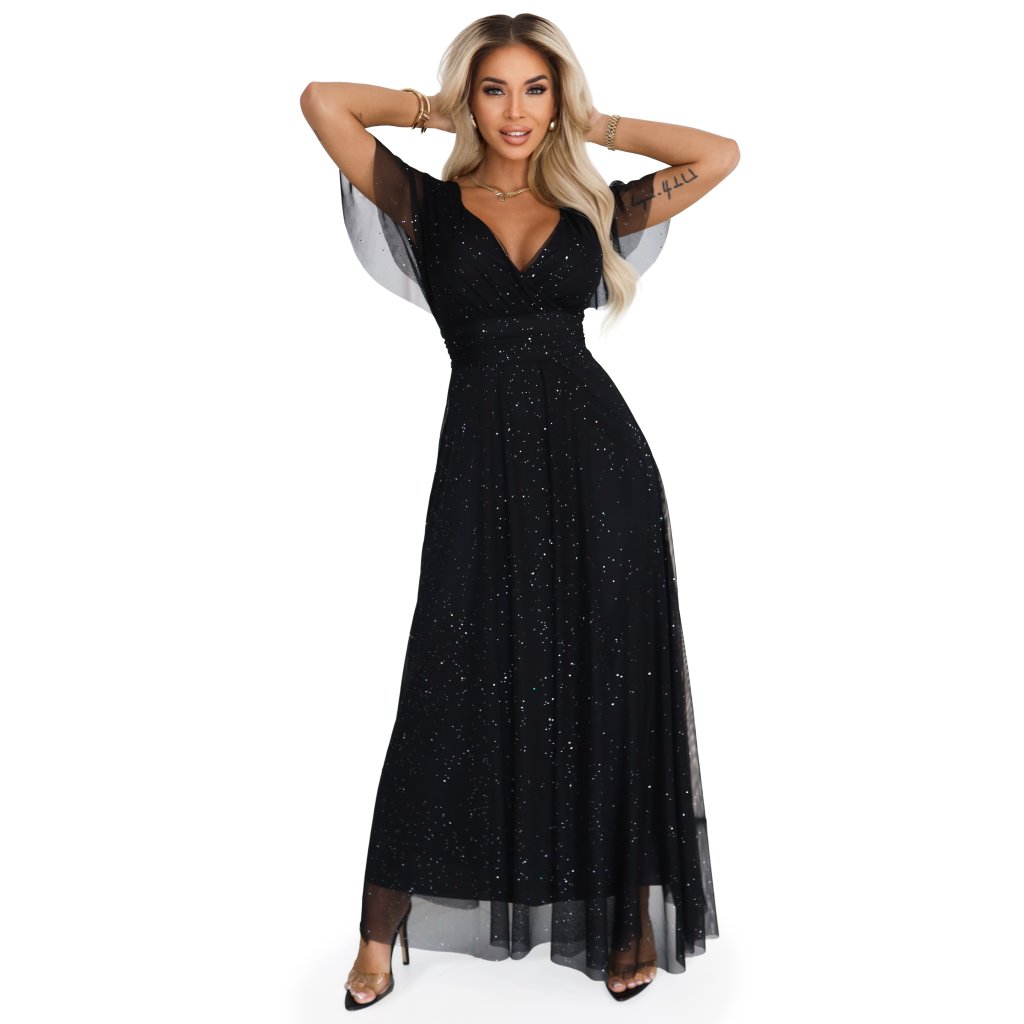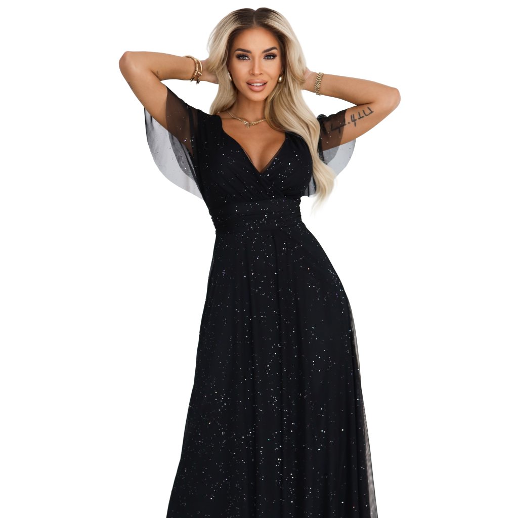 Elegantné dlhé večerné šaty v čiernej farbe sú návrhom značky Numoco Basic, vytvoreným s myšlienkou na výnimočné príležitosti. Trblietavý materiál s jemným glitrovaným povrchom krásne odráža svetlo, dodávajúc kreácii jedinečné čaro. Výstrih v tvare písmena V jemne zdôrazňuje poprsie, zatiaľ čo ľahké, vzdušné rukávy dodávajú celku ľahkosť a eleganciu.