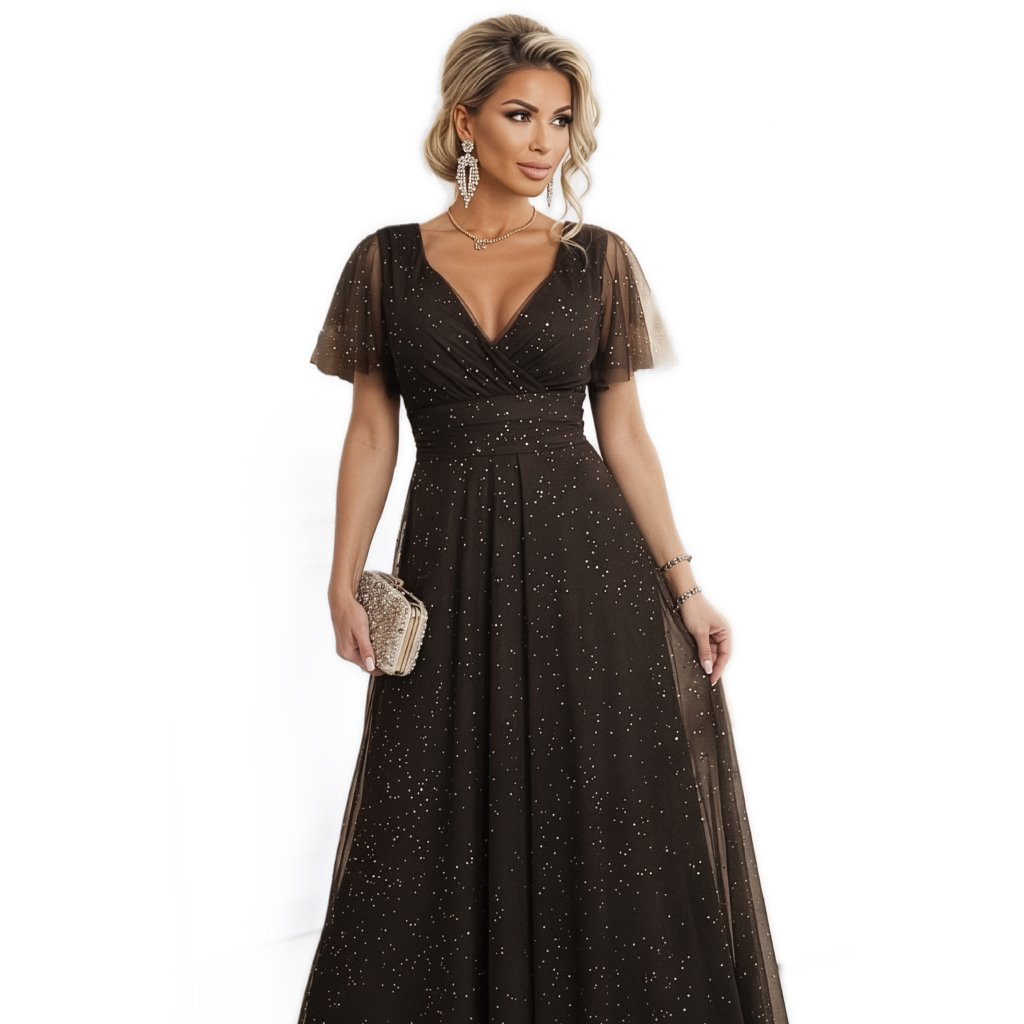 Elegantné dlhé čokoládové šaty s trblietkami - Numoco Basic