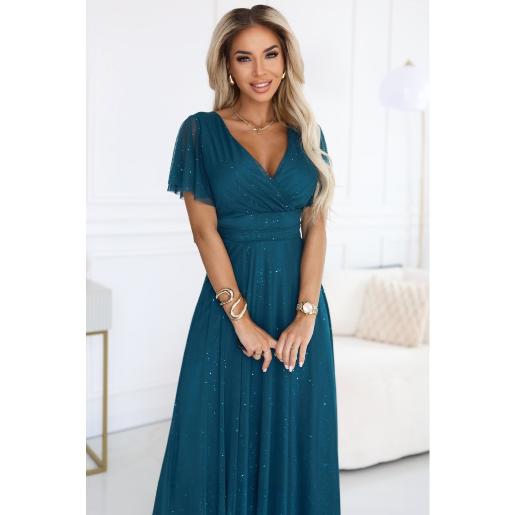 MELANIA Dlhé, lesklé šaty s výstrihom a krátkymi rukávmi - fľaškovo zelené 635-1