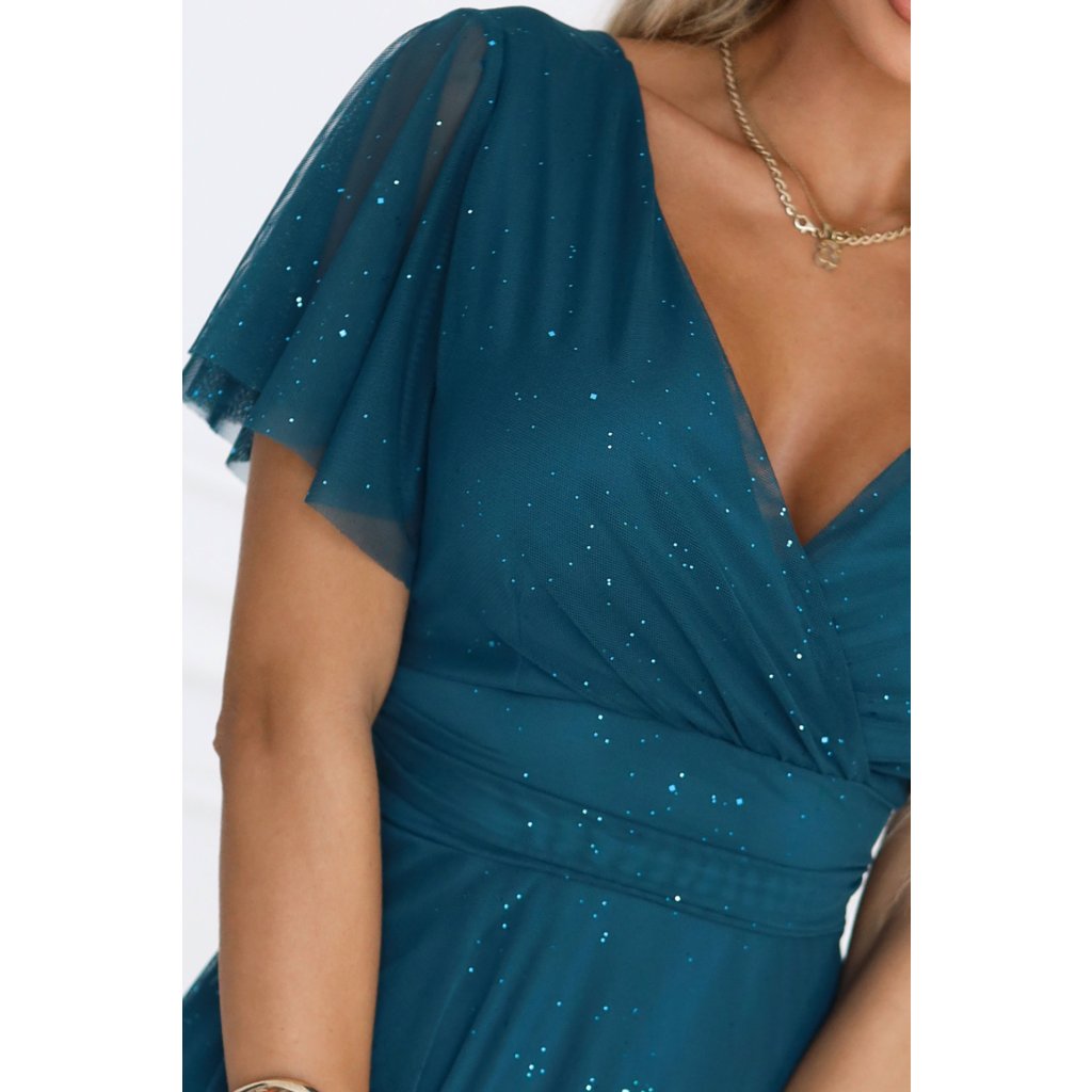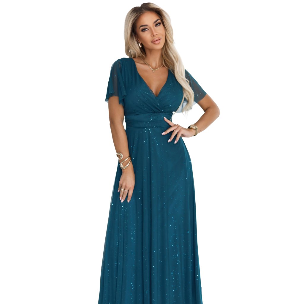 Elegantné šaty MELANIA vo farbe fľaškovo zelenej sú výnimočným návrhom značky Numoco Basic. Dlhá, trblietavá kreácia s jemným V výstrihom a ľahkým, vzdušným rukávom krásne zdôrazňuje ženskú siluetu. Rozšírená spodná časť zaisťuje voľnosť pohybu a robí šaty dokonalými pri tanci.