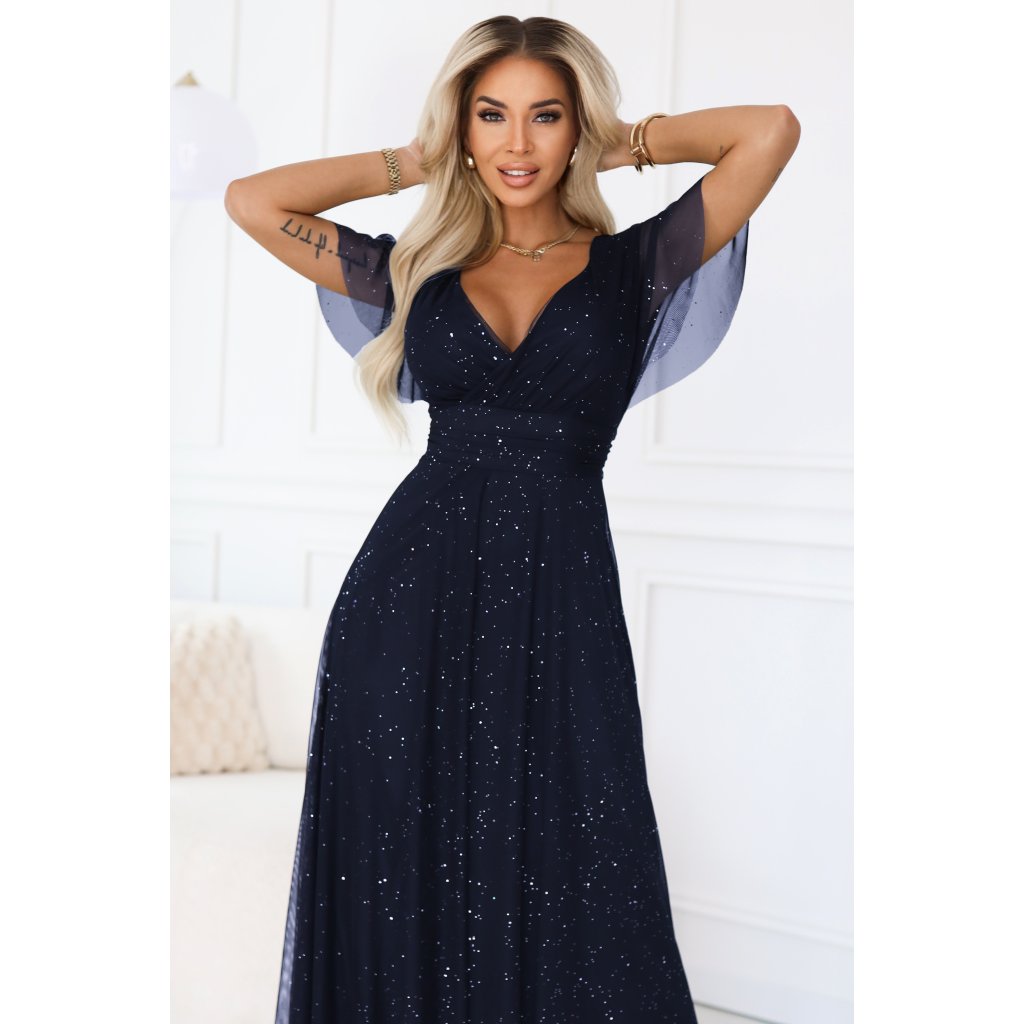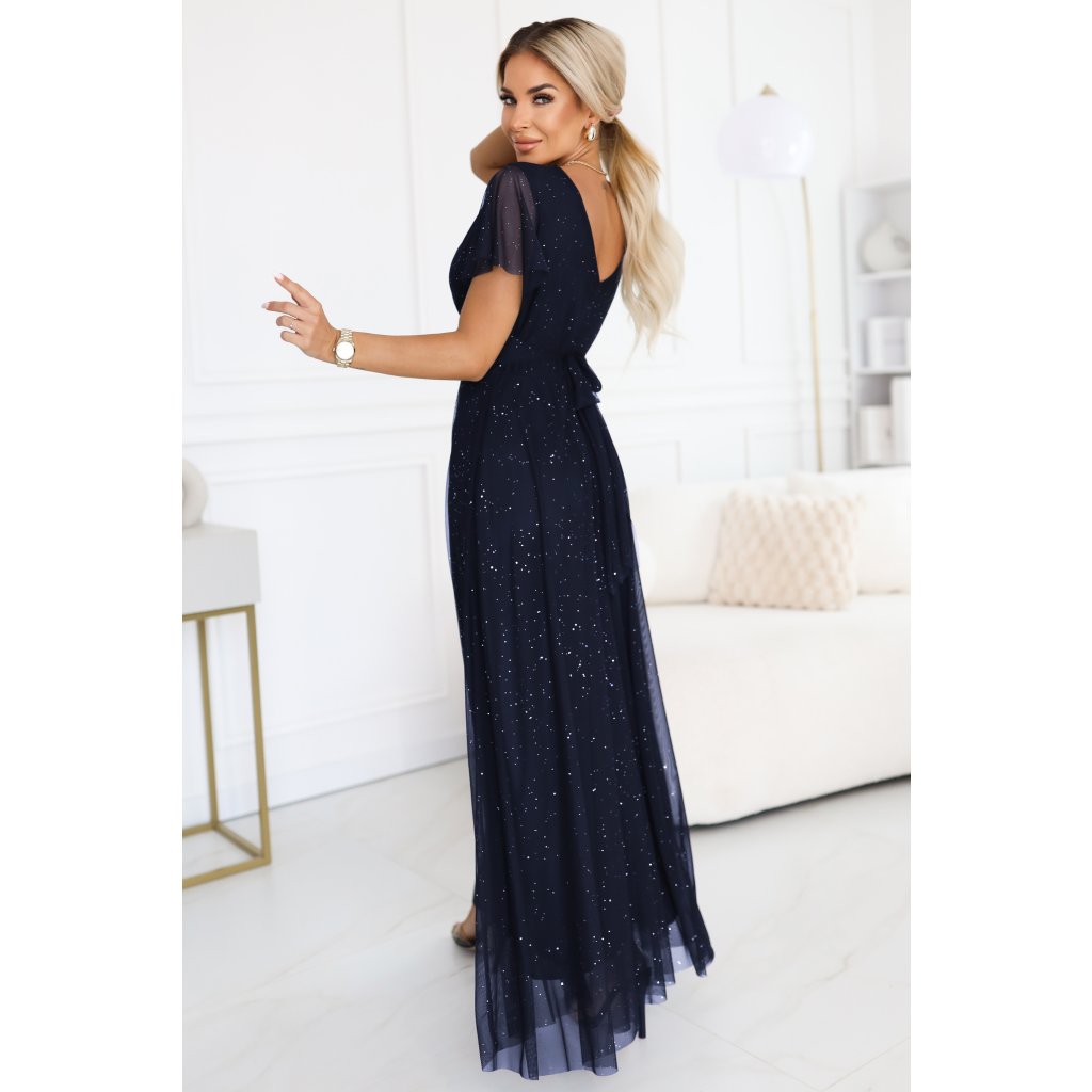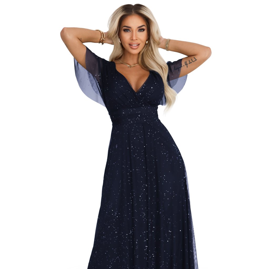 MELANIA dlhé, lesklé šaty s výstrihom a krátkymi rukávmi - tmavomodré 635-3