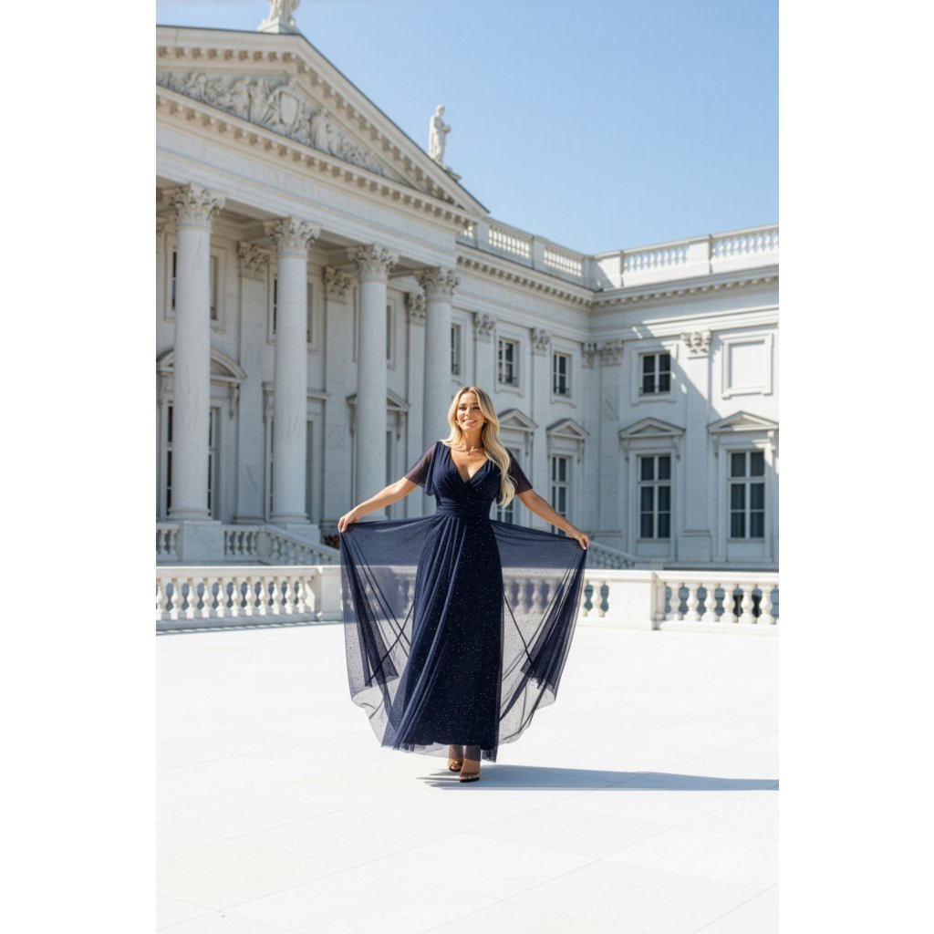 Oslnivé dlhé spoločenské šaty značky Numoco Basic sú návrhom pre ženy, ktoré rady vyzerajú elegantne a moderne. Tmavomodrá látka pokrytá drobnými, lesklými bodkami pripomína hviezdnu oblohu, zatiaľ čo zavinovací výstrih krásne zdôrazňuje poprsie a predlžuje krk. Vzdušné, jemne priesvitné rukávčeky dodávajú ľahkosť a priliehavý pás plynule prechádza do voľne padajúcej spodnej časti šiat, čím vytvára veľmi ženskú siluetu.
