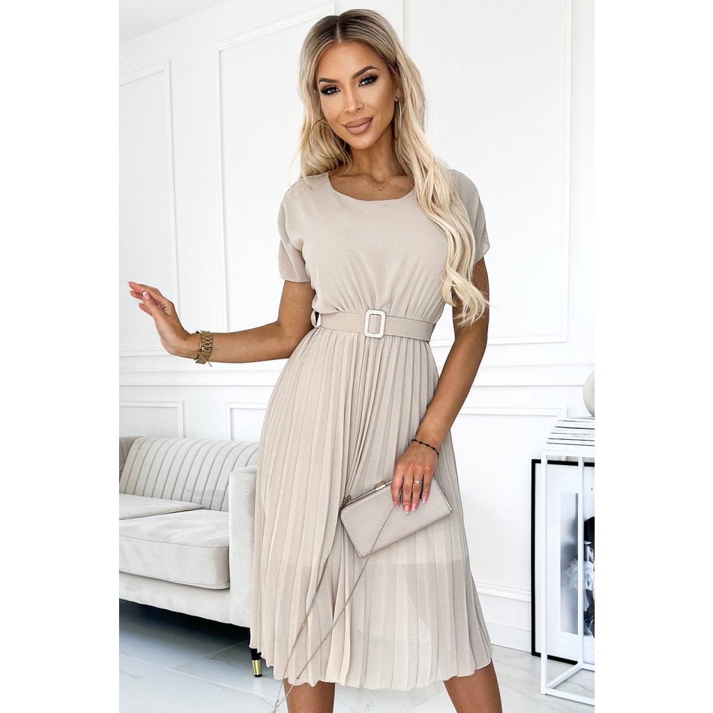 Plisované šaty MIA s okrúhlym výstrihom, širokým opaskom a krátkymi rukávmi. Vyrobené z béžovej šifónovej látky s podšívkou. Perfektné šaty pre každú príležitosť. Značka Numoco. európska produkcia.