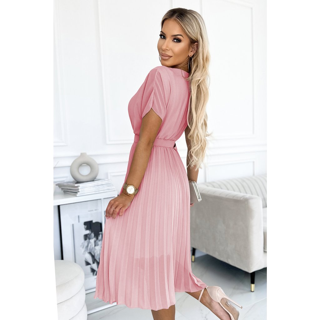 Plisované šaty MIA s okrúhlym výstrihom, širokým opaskom a krátkymi rukávmi. Vyrobené zo šifónovej látky s podšívkou. Farba: špinavo ružová. Perfektné šaty pre každú príležitosť. Značka Numoco. európska produkcia.