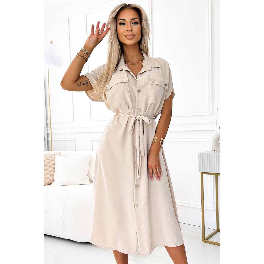 Béžové košeľové šaty so zlatými gombíkmi, zaväzovaním v páse a krátkymi rukávmi. Základná značka Numoco. európska produkcia.
