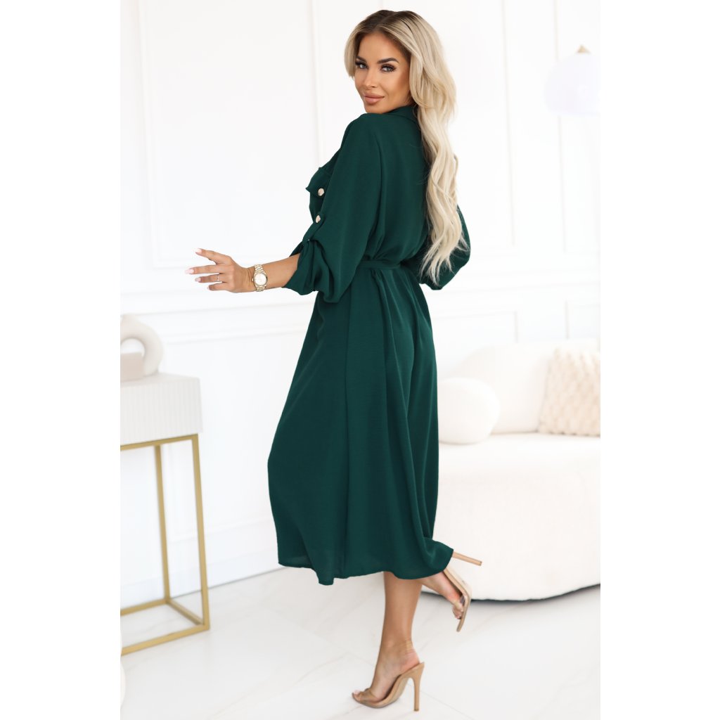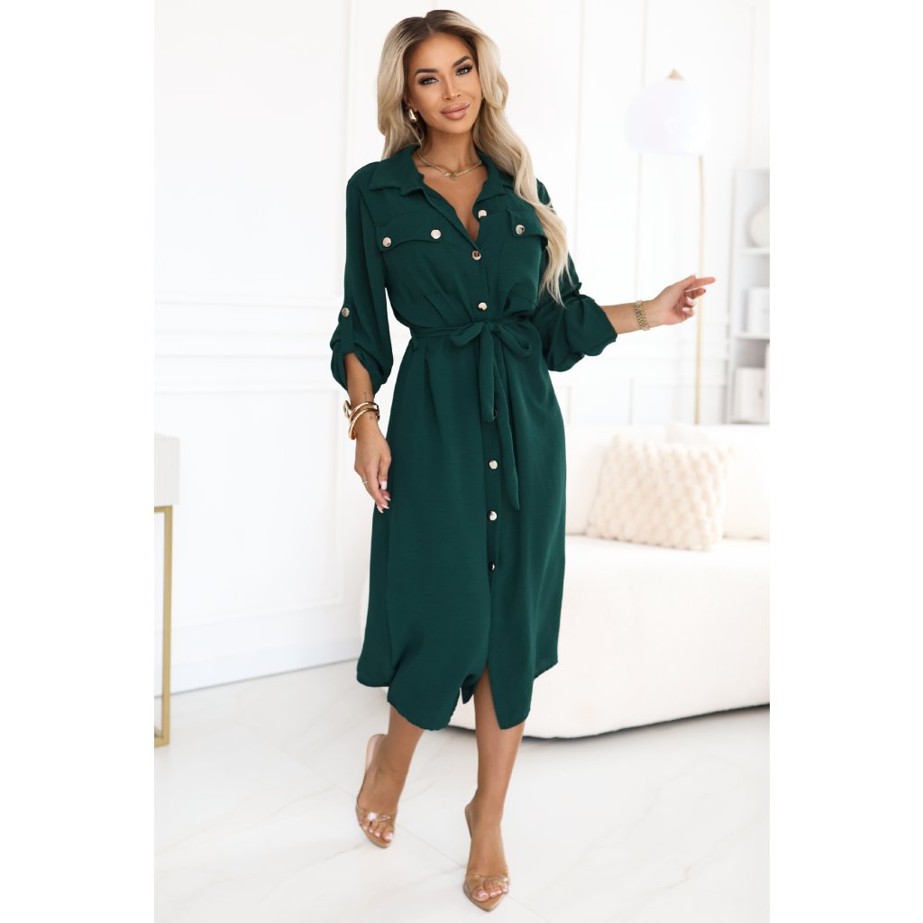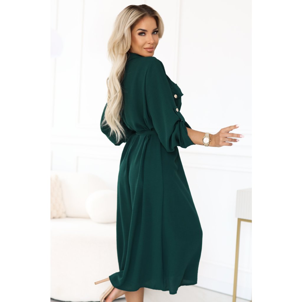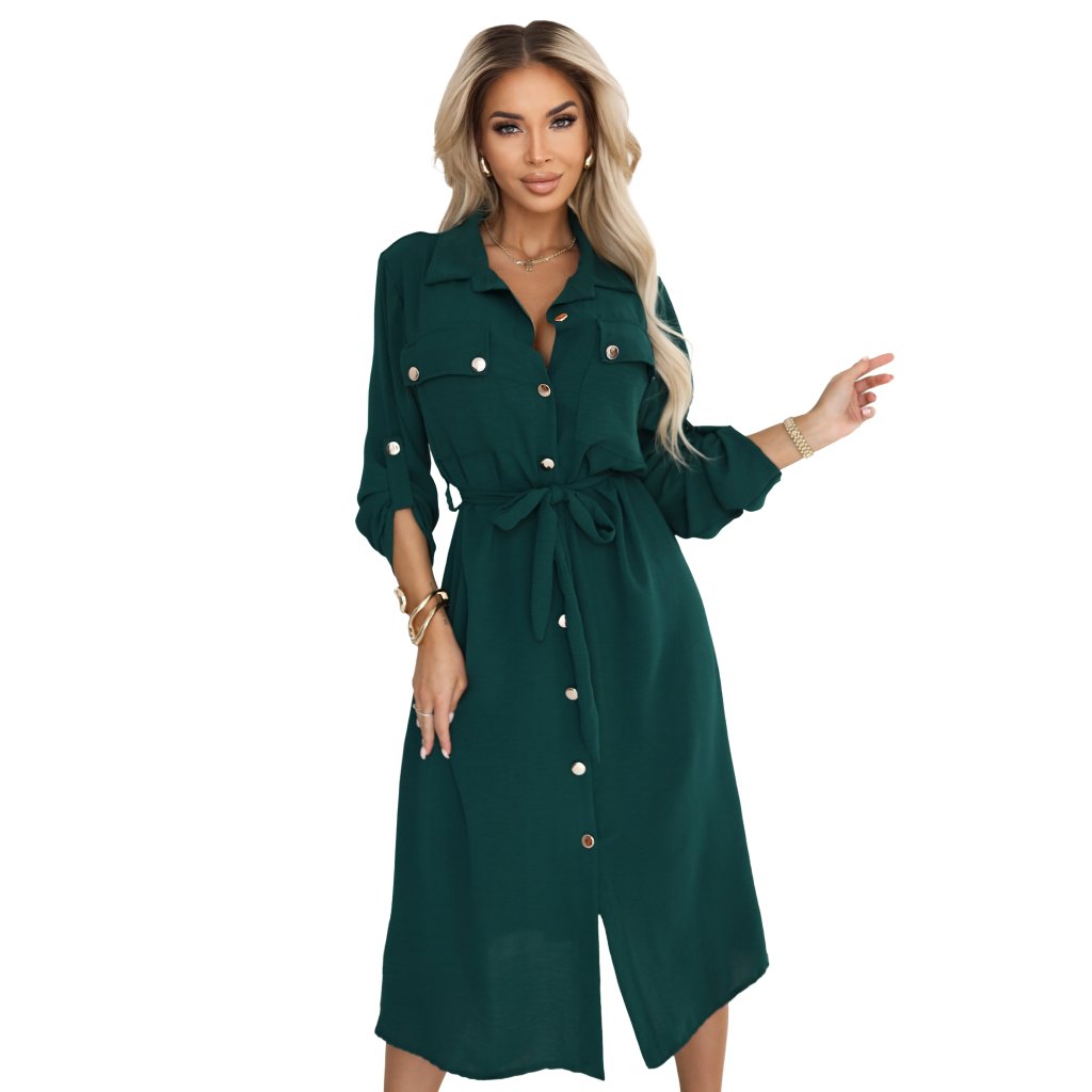 Elegantné zelené midi košeľové šaty s opaskom v páse, zapínaním na gombíky a náprsnými vreckami. Rukávy s gombíkmi sú ideálne na každodenné nosenie, do práce aj na stretnutia. Značka: Numoco Basic. Vyrobené v Európe.