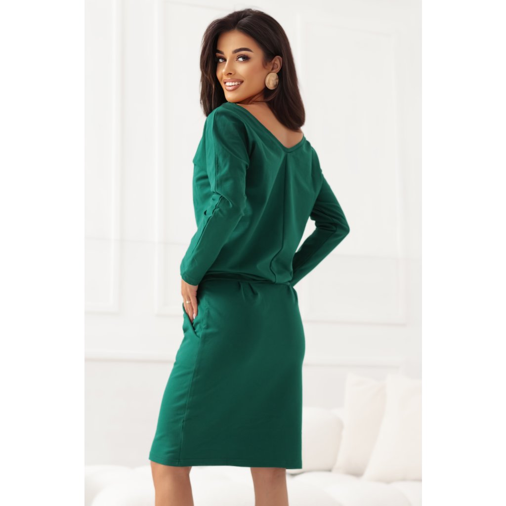 Zelené mikinové šaty s vreckami a voľným chrbtovým výstrihom. Ideálne na každodenné nosenie aj do práce. Vyrobené v Poľsku – Numoco.