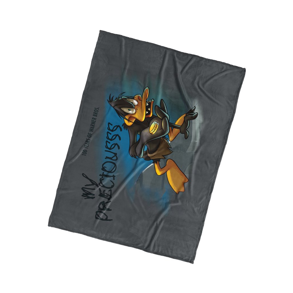 Na sivej deke je zobrazená jedna z obľúbených kreslených postavičiek Looney Tunes, Daffy Duck