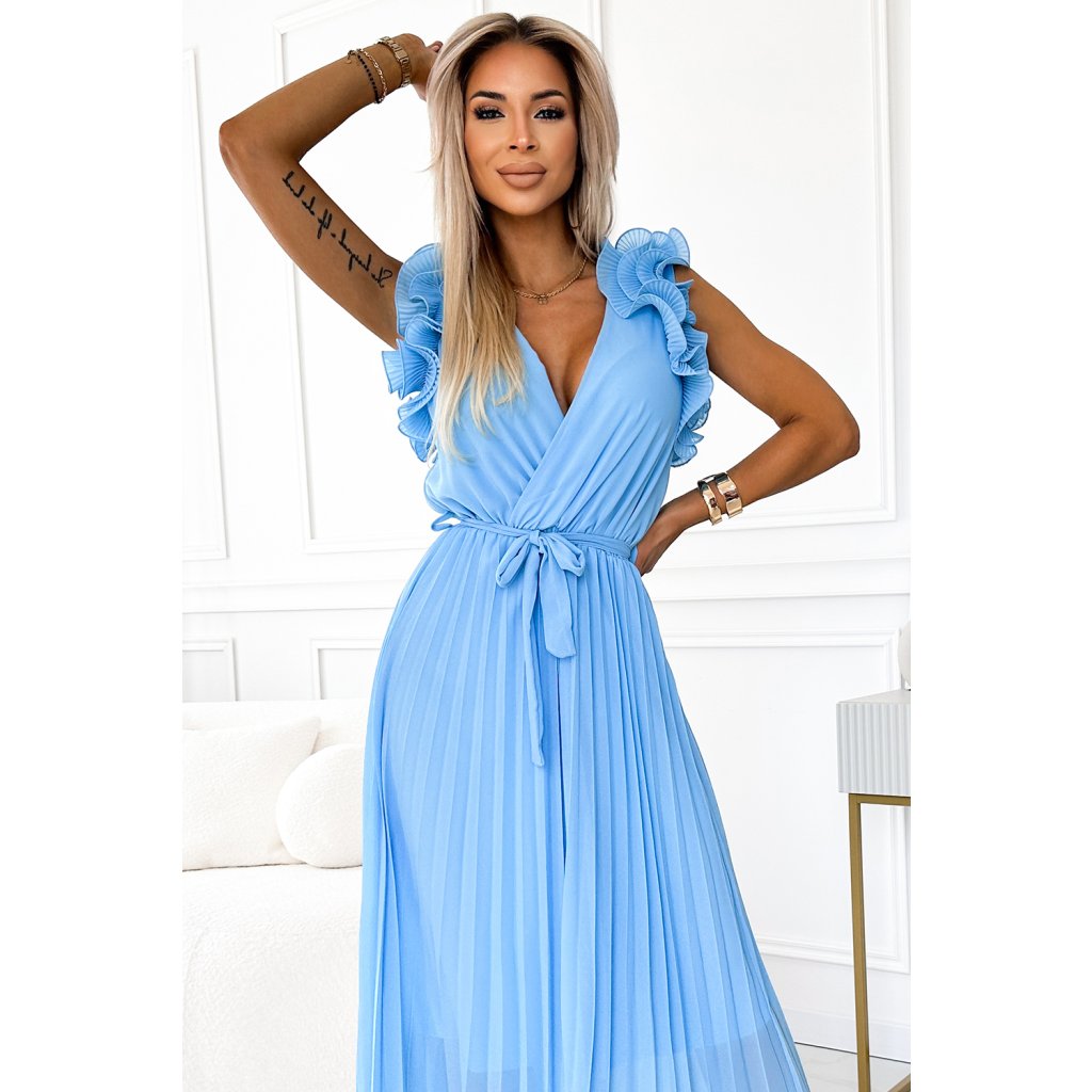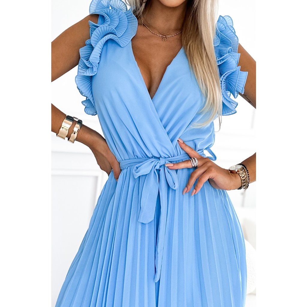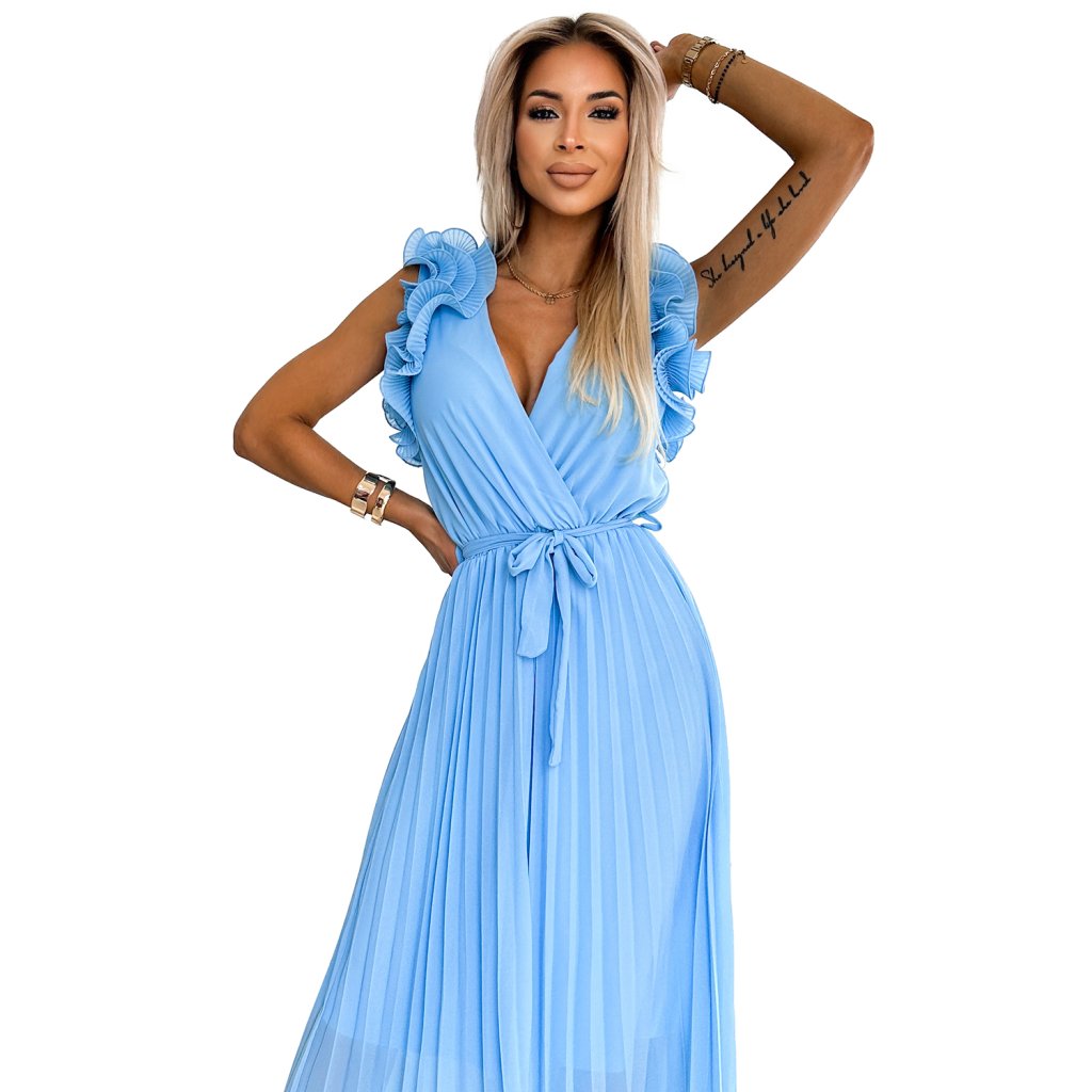 Mirabella - riasené šaty s listovým výstrihom, opaskom a jemnými volánikmi. Vyrobené zo svetlomodrého šifónového materiálu s podšívkou. Perfektné šaty pre každú príležitosť. Základná značka Numoco. európska produkcia.