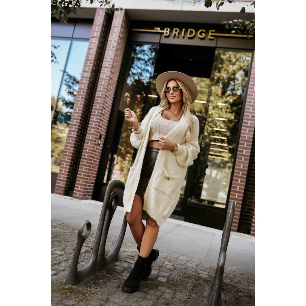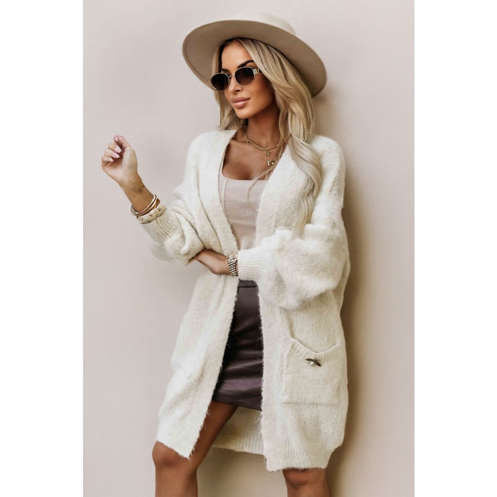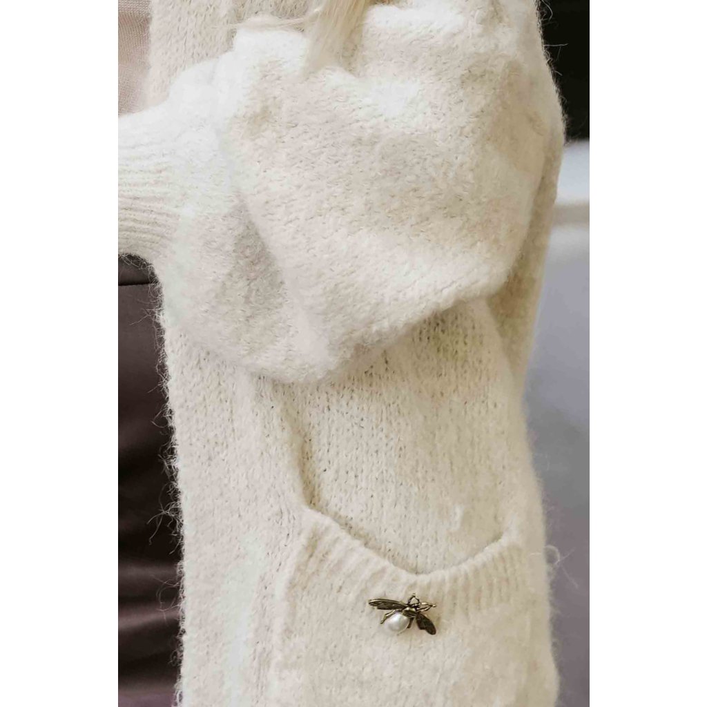 Módny oversized kardigán s ozdobnou brošňou a praktickými vreckami - béžový 628-1