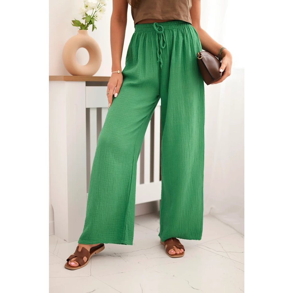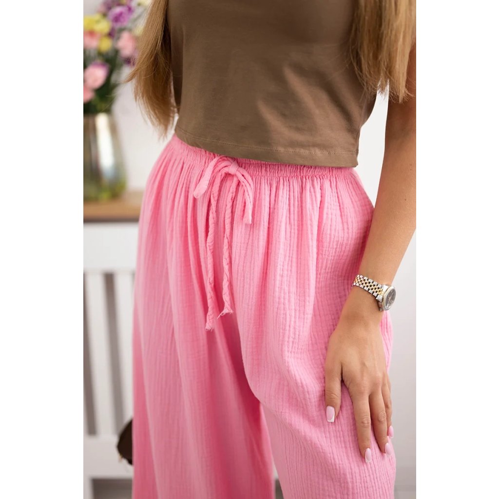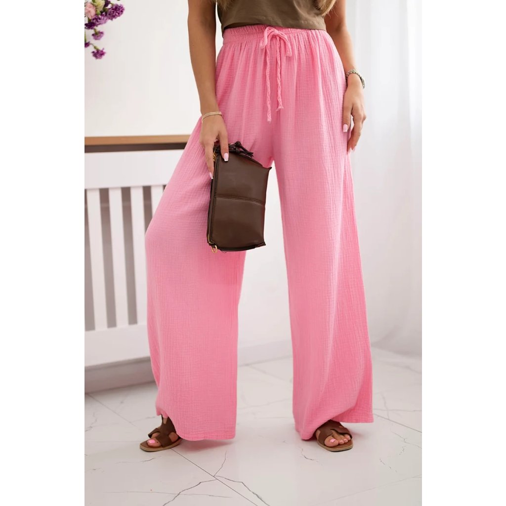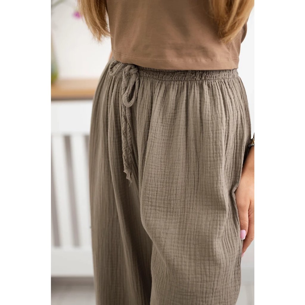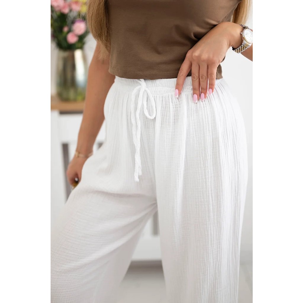 Objavte jedinečné nohavice z mäkkého, priedušného mušelínu, ktoré poskytujú nevídané pohodlie pri nosení aj počas najhorúcejších dní. Ich široké nohavice dodávajú celému oblečeniu módny, moderný charakter, opticky predlžujú postavu a dodávajú celkovému štýlu ľahkosť. Tieto nohavice sú ideálne na každodenné nosenie, do práce aj na špeciálne príležitosti a skvele sa hodia k rôznym zvrškom, od minimalistických tričiek až po elegantné blúzky a svetre. Stavte na klasický, ale sofistikovaný dizajn, ktorý vám umožní vychutnať si pohodlie aj originálny štýl. Veľkosť je univerzálna a zodpovedá veľkosti S, M alebo L.
