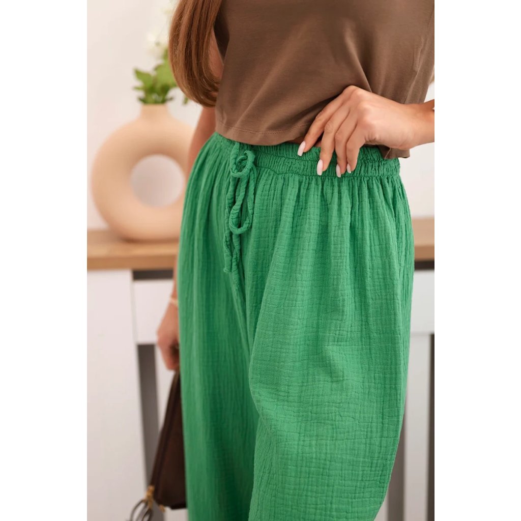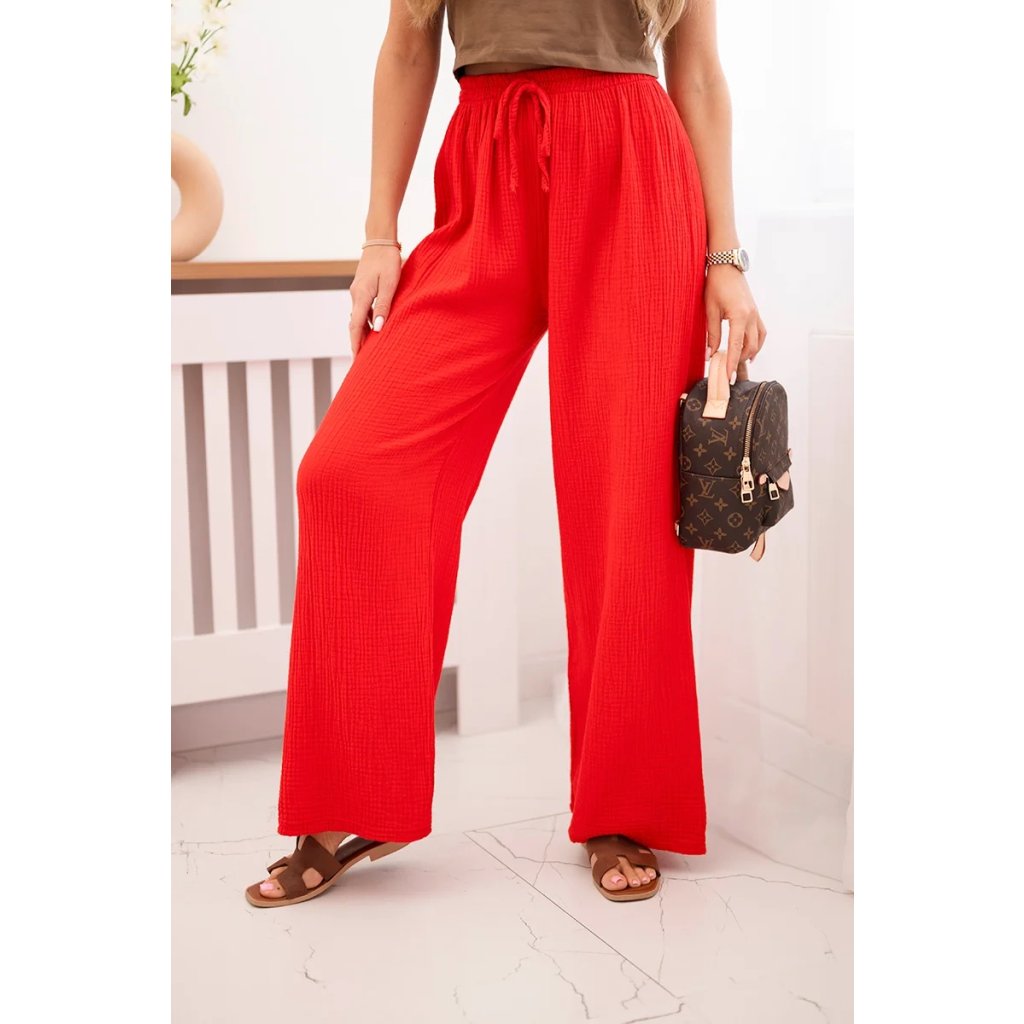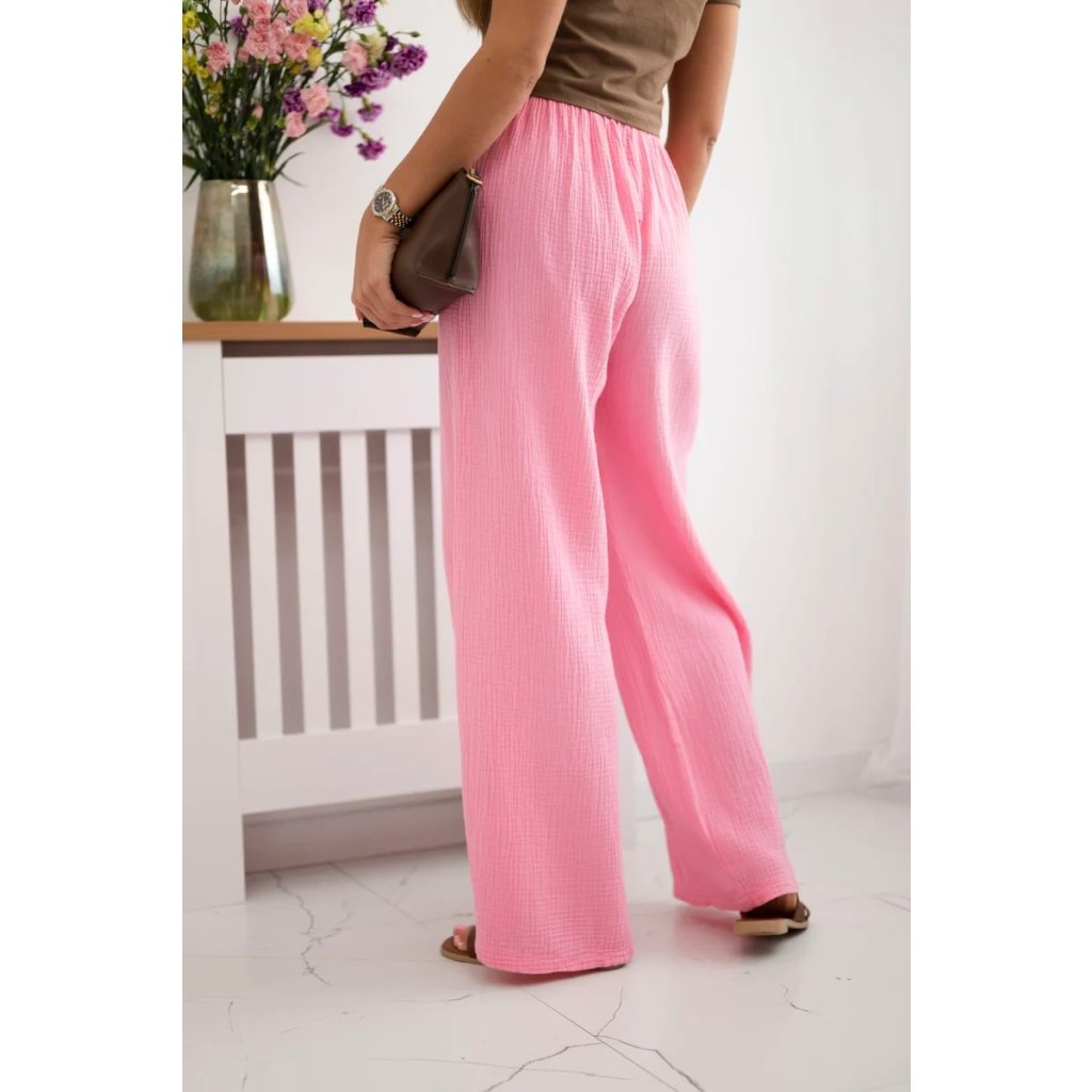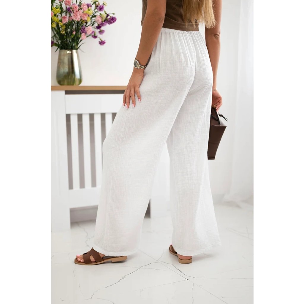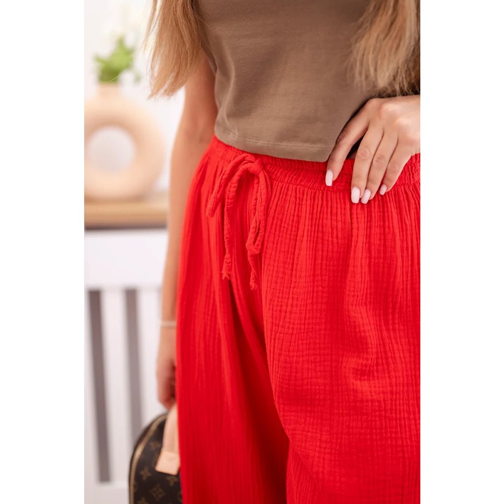 Objavte jedinečné nohavice z mäkkého, priedušného mušelínu, ktoré poskytujú nevídané pohodlie pri nosení aj počas najhorúcejších dní. Ich široké nohavice dodávajú celému oblečeniu módny, moderný charakter, opticky predlžujú postavu a dodávajú celkovému štýlu ľahkosť. Tieto nohavice sú ideálne na každodenné nosenie, do práce aj na špeciálne príležitosti a skvele sa hodia k rôznym zvrškom, od minimalistických tričiek až po elegantné blúzky a svetre. Stavte na klasický, ale sofistikovaný dizajn, ktorý vám umožní vychutnať si pohodlie aj originálny štýl. Veľkosť je univerzálna a zodpovedá veľkosti S, M alebo L.