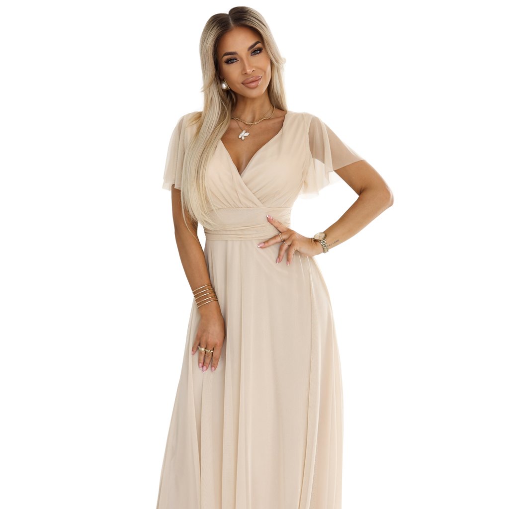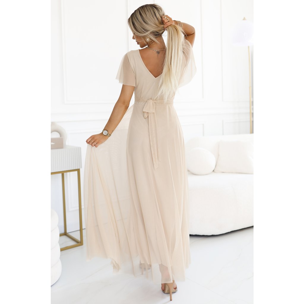 Vzdušné maxi šaty z elastickej sieťoviny v elegantnej béžovej farbe. Obálkový výstrih, jemné rukávy a zaväzovanie v páse krásne zvýrazňujú siluetu. Značka Numoco Basic, európska výroba.