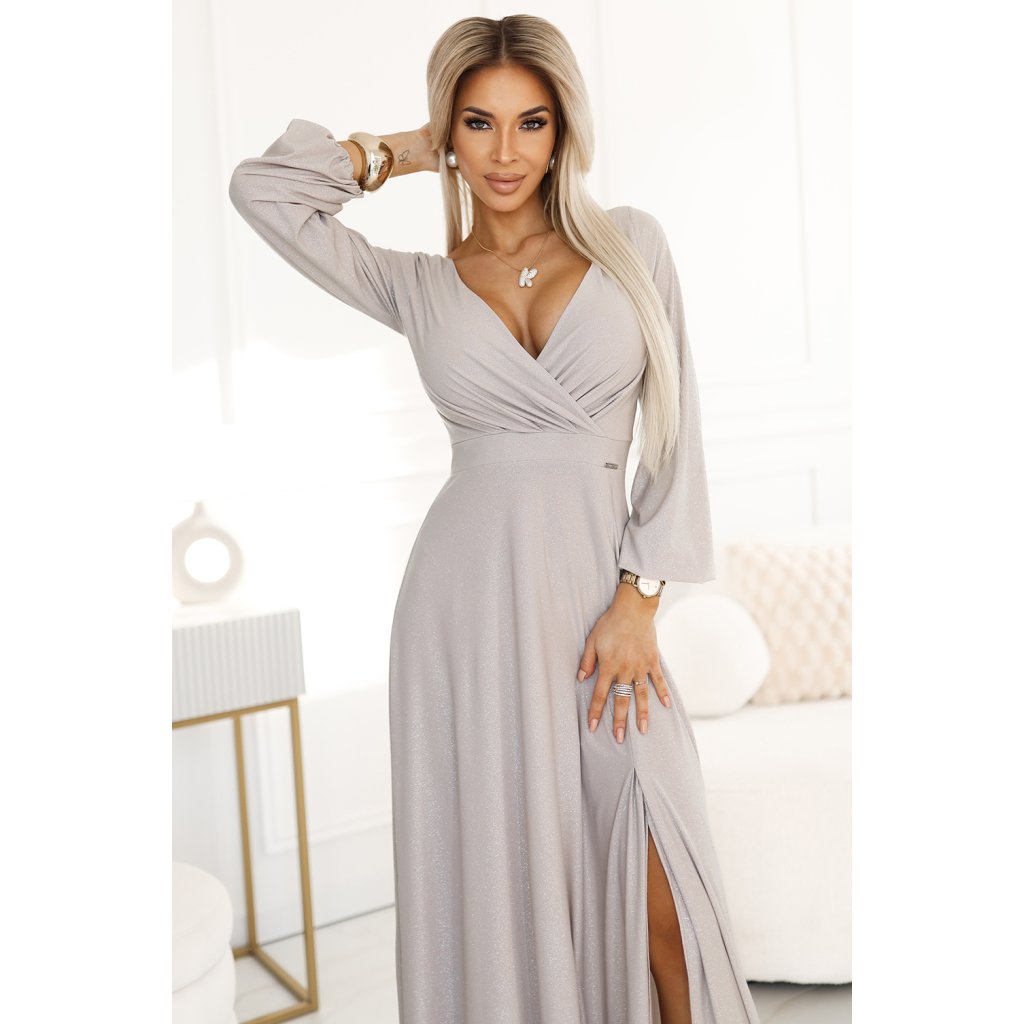 Elegantné maxi šaty so zavinovacím výstrihom, dlhým rukávom a efektným rozparkom na nohavici. Vyrobené z trblietavého materiálu v odtieni béžovej, krásne zvýraznia siluetu a potešia svojím jemným leskom. Ideálne pre zvláštne príležitosti. Poľský výrobok. Značka Numoco.