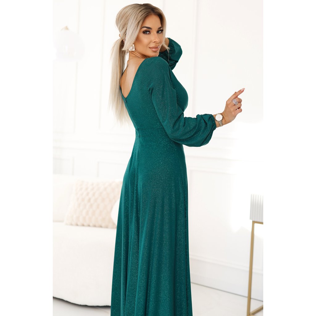 Elegantné dlhé šaty so zavinovacím výstrihom, dlhými rukávmi a zmyselným rozparkom na nohavici. Vyrobené z fľaškovo zeleného trblietavého materiálu, krásne zvýrazňuje siluetu a dodáva štýlu jedinečný lesk. Perfektná voľba na svadbu, ples alebo elegantnú párty. Poľský výrobok. Značka Numoco.