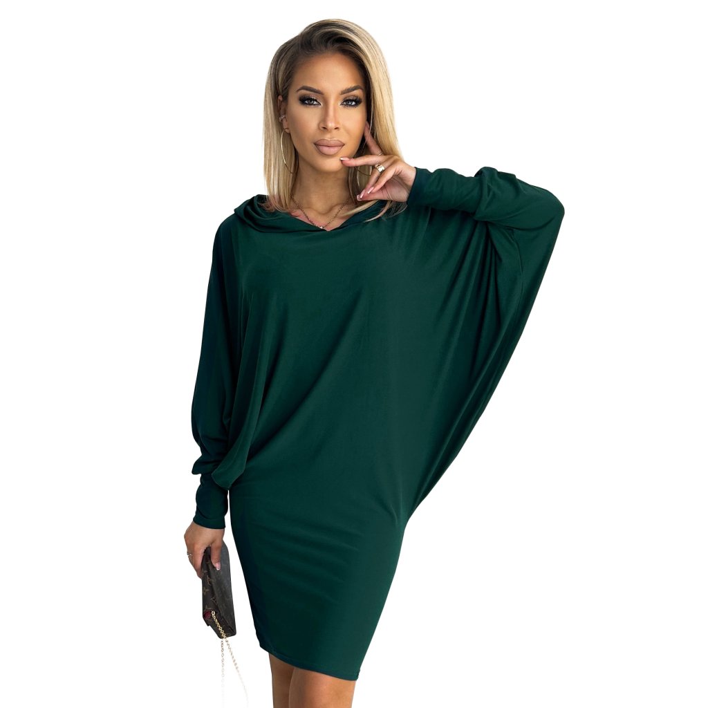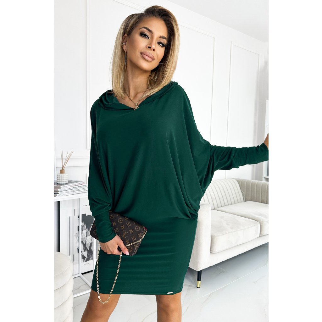 Netopierie šaty s kapucňou. Vyrobené z elastického zeleného materiálu so semišovou štruktúrou. Dá sa nosiť na mnoho spôsobov. Značka Numoco. Poľská výroba.